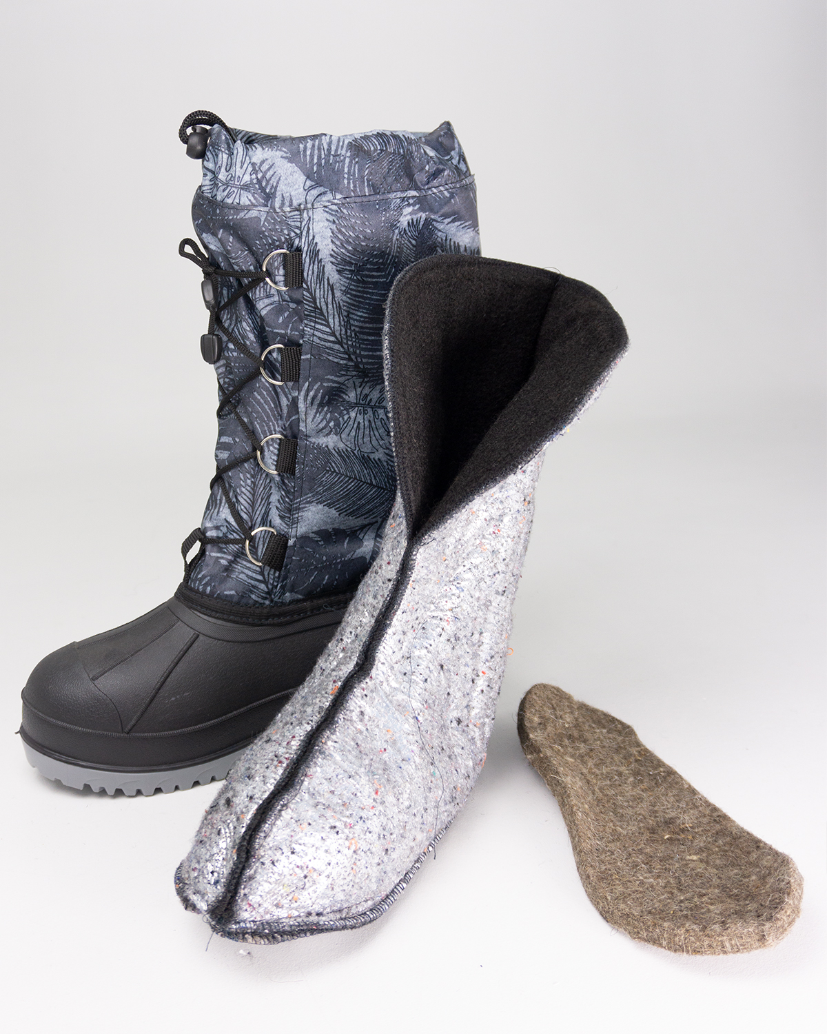 Увеличенная толщина в носочной части галоши. Шпора для удобства снятия. Возможность ошиповки под заказ. Комфортная температура до – 30. Голенище двухслойное, утеплено нетканым полотном плотностью 350 гр/м кВ. Ткань голенища высокопрочный Оксфорд, цвет камуфляж, с водооталкивающей пропиткой. Форма голенища анатомическая. Метод крепления прошивной через тесьму, в две строчки нитками ЛЛ, ЛХ на 100. Утепляющий чулок 3-х слойный: фольга и два слоя нетканого полотна ТМ Полизон. Дополнительная войлочная стелька в галоше. Фиксация на ноге шнурами по голенищу через полукольца и через фиксатор шнуром по верху голенища, затягивающийся через фиксатор шнур по верху голенища.