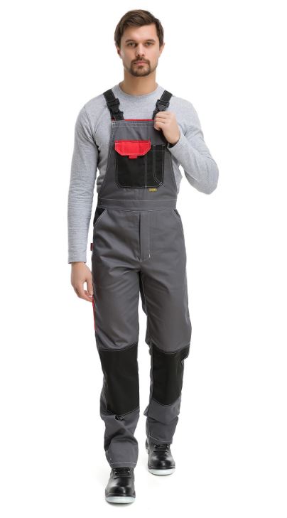 На задних половинках полукомбинезона расположены накладные карманы с петлей и карманом под инструменты. По линии талии сзади на полукомбинезоне расположена эластичная лента, благодаря которой полукомбинезон плотно прилегает к талии.