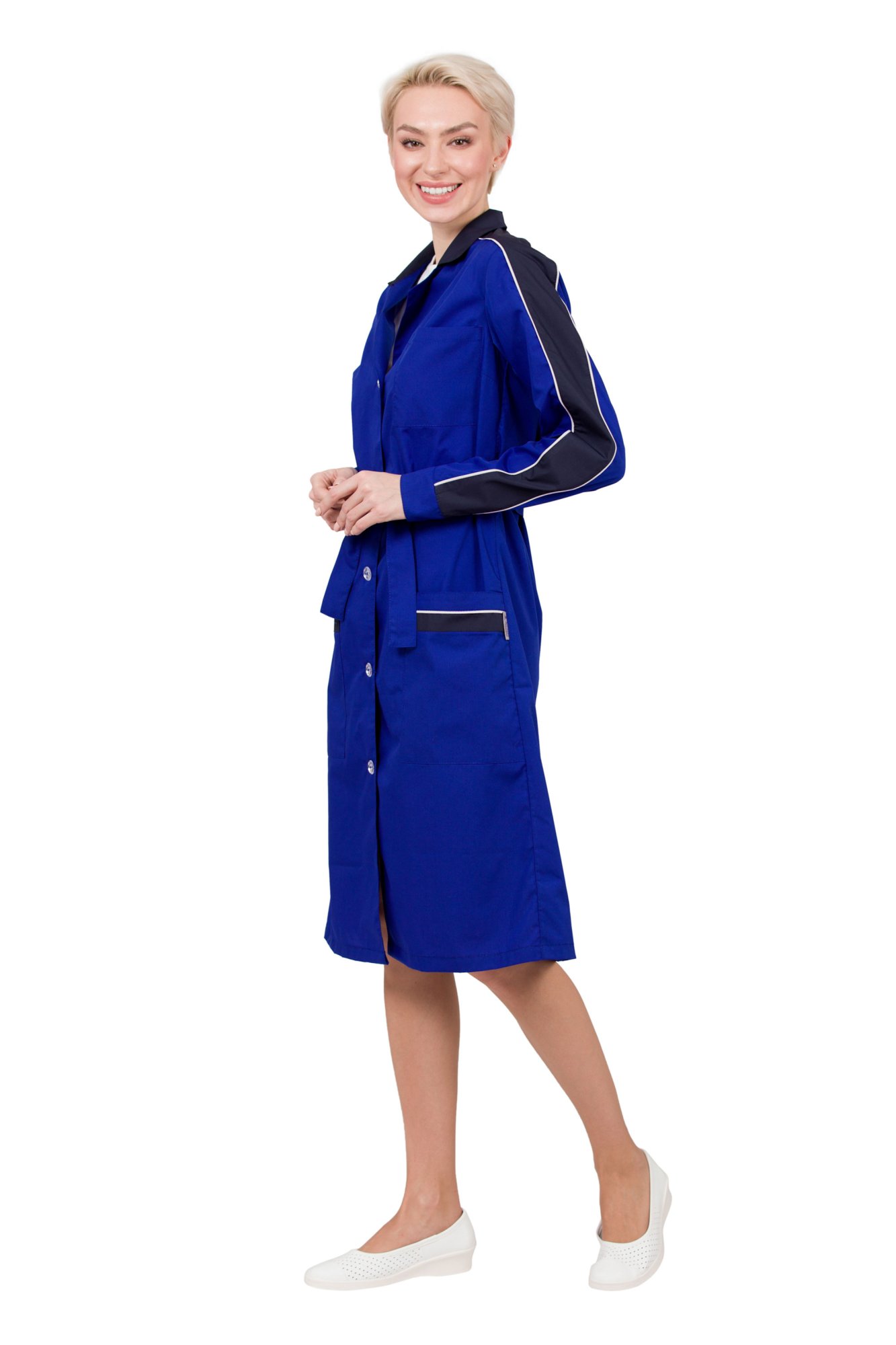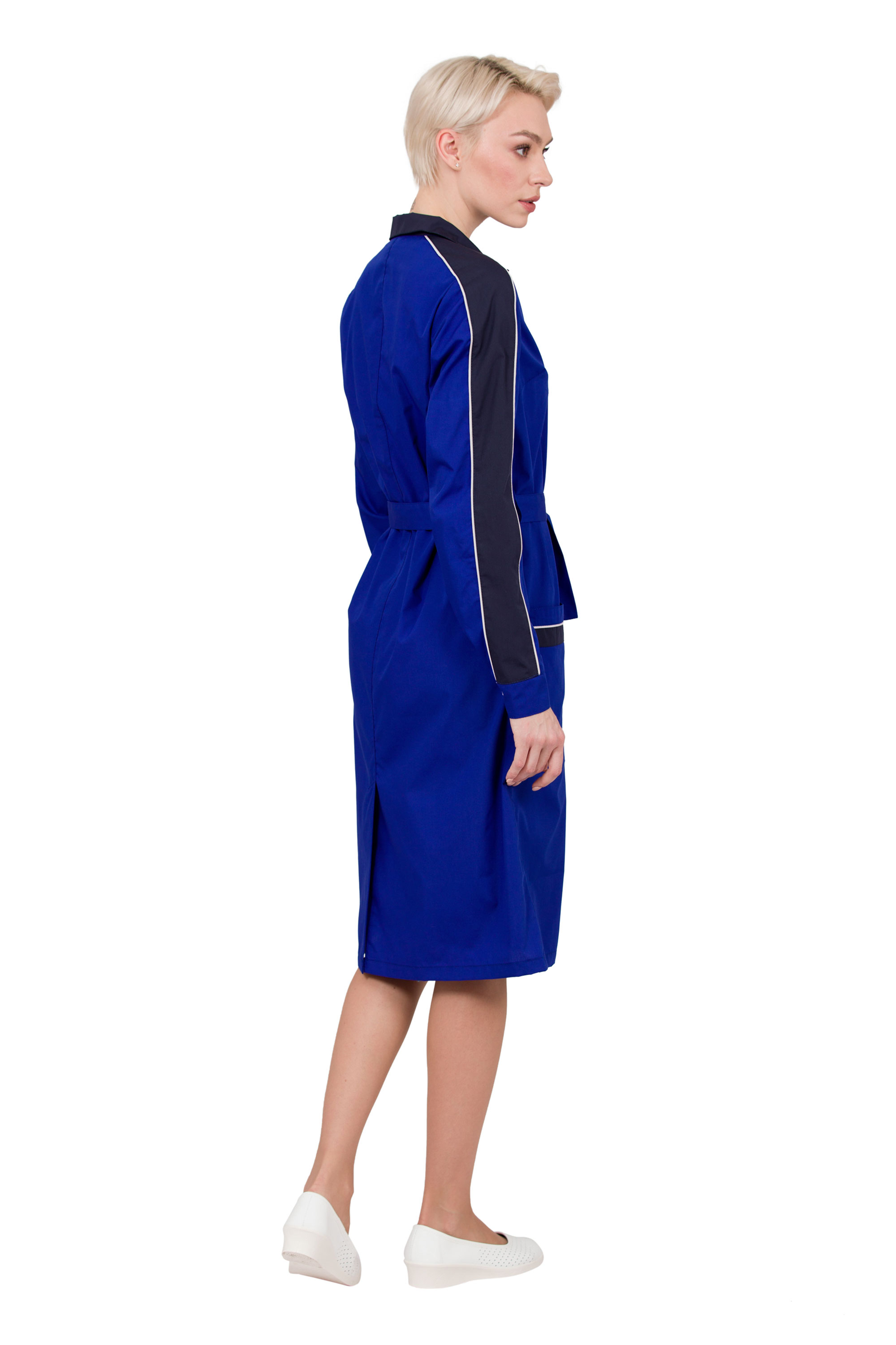 Халат полуприлегающего силуэта с центральной застежкой на пуговицы, отложным воротником, с накладными и нагрудным карманами, рукав - длинный, объем по талии регулируется поясом.