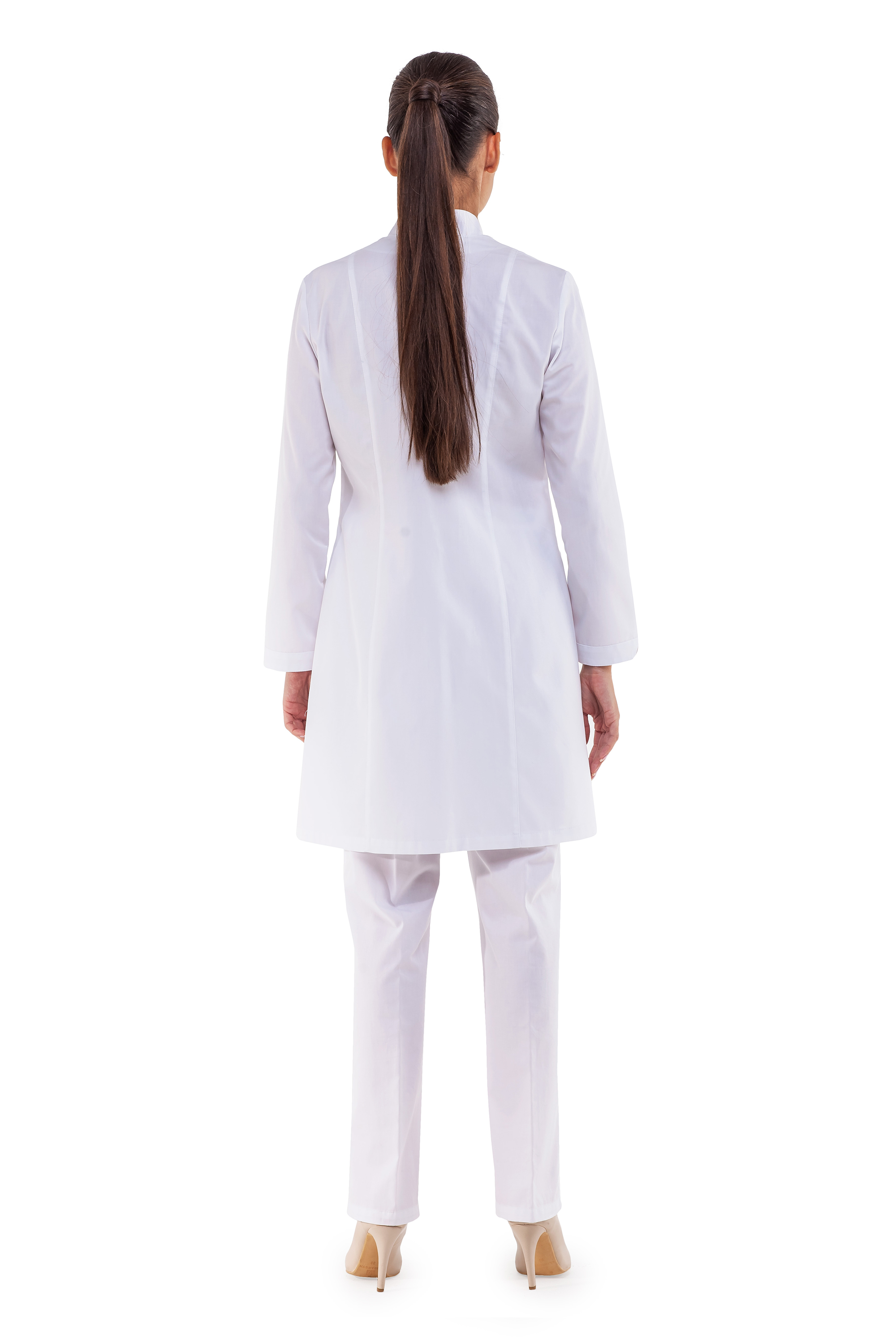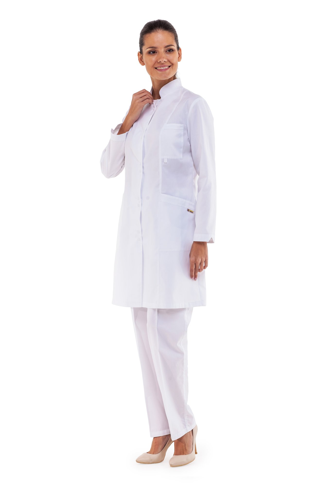Два нижних кармана и один нагрудный карман с петлей для крепления бейджа. Длина халата до середины колена, что позволяет носить халат как отдельным предметом так и в комплекте с брюками. Отделка белым кантом по контуру стойки, карманам и низу рукавов.