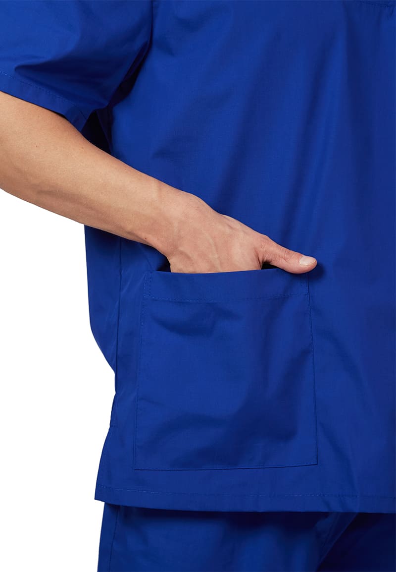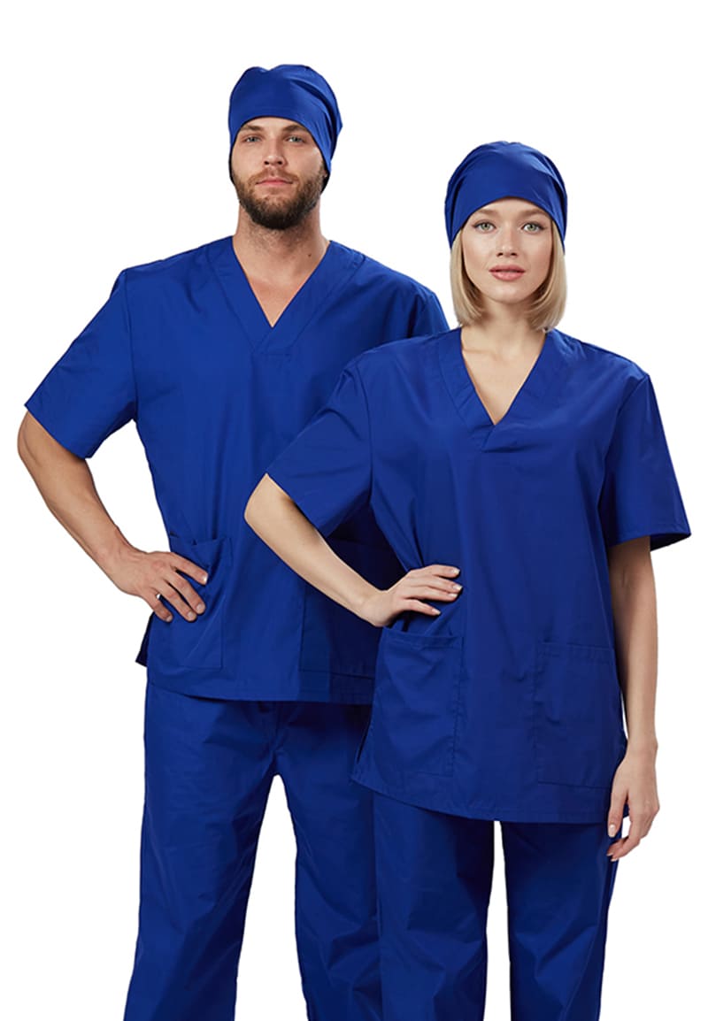 Блузон прямого силуэта, с V-образным вырезом по линии горловины, коротким рукавом и боковыми разрезами. В нижней части полочки накладные карманы. Спинка с кокеткой и двумя складками. Брюки прямые на поясе с резинкой. Колпак с завязками в задней части.