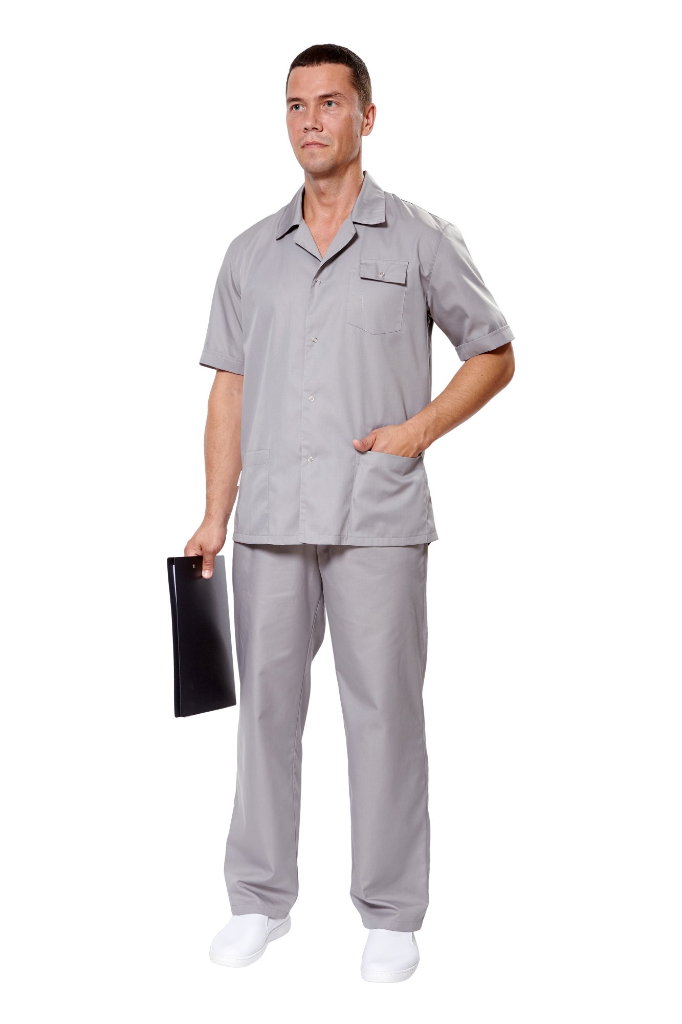 На спинке складки, обеспечивающие свободу при движении. Два нижних кармана и один нагрудный карман с клапаном и отделением для ручки. Ширина низа рукава регулируется при помощи кнопок.