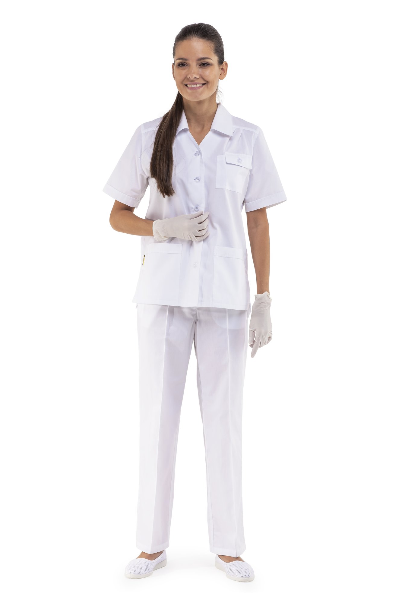 Два нижних кармана и один нагрудный карман с клапаном и с отделением для ручки. Складки на полочках и на спинке создают удобство при движении. Отделка широким белым кантом по контуру воротника, карманам и низу рукавов.
