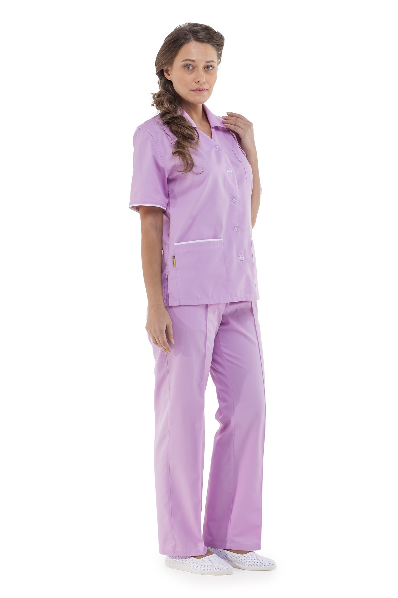 Два нижних кармана и один нагрудный карман с клапаном и с отделением для ручки. Складки на полочках и на спинке создают удобство при движении. Отделка широким белым кантом по контуру воротника, карманам и низу рукавов.
