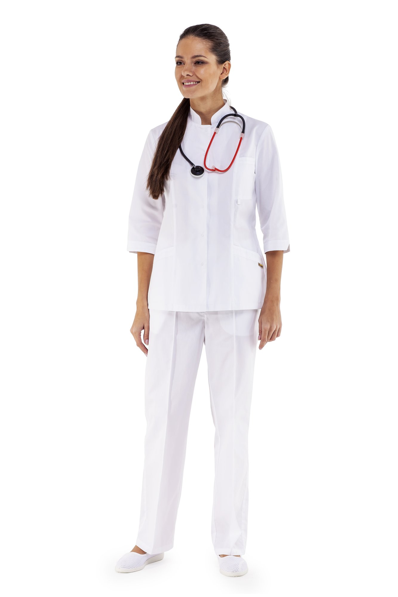 Рукава длиной 3/4. Застежка на кнопки. Два нижних кармана и один нагрудный карман с петлей для крепления бейджа. Отделка белым кантом по контуру стойки, карманам и низу рукавов.