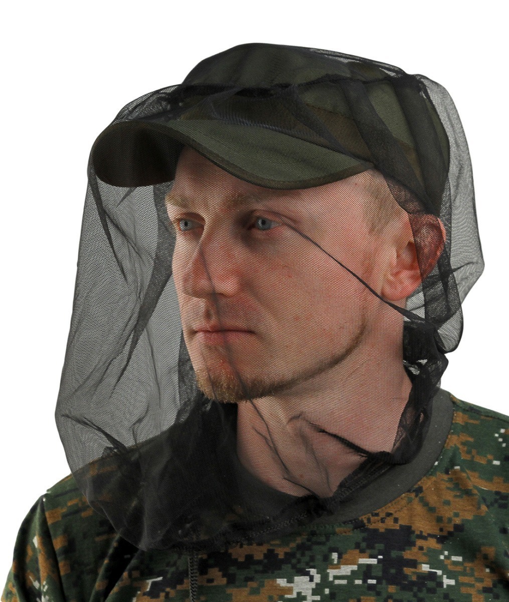 Лёгкая сетка, цвет чёрный или хаки, продуваемая, стягивается на шее, что не позволяет пробраться ни одному насекомому.