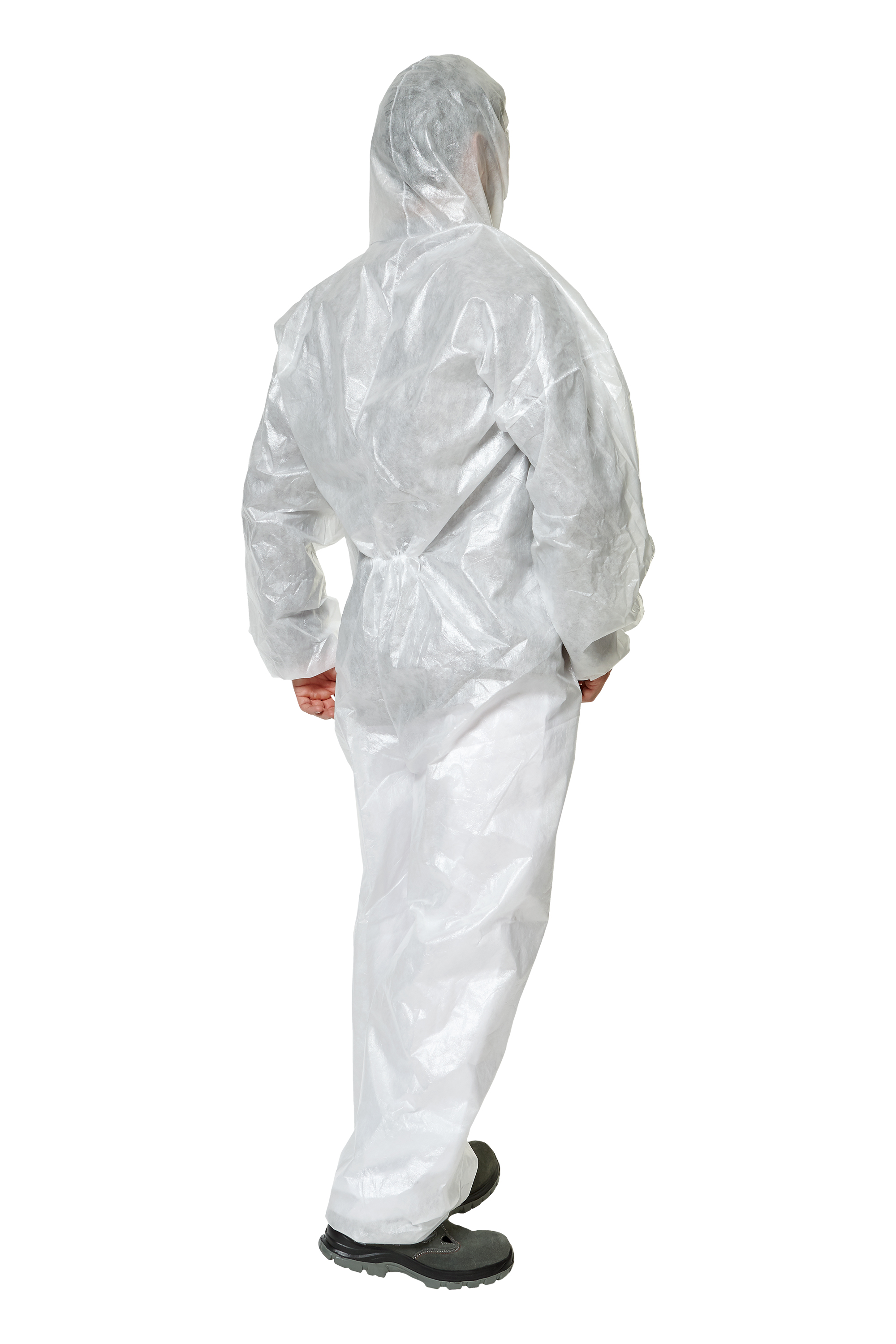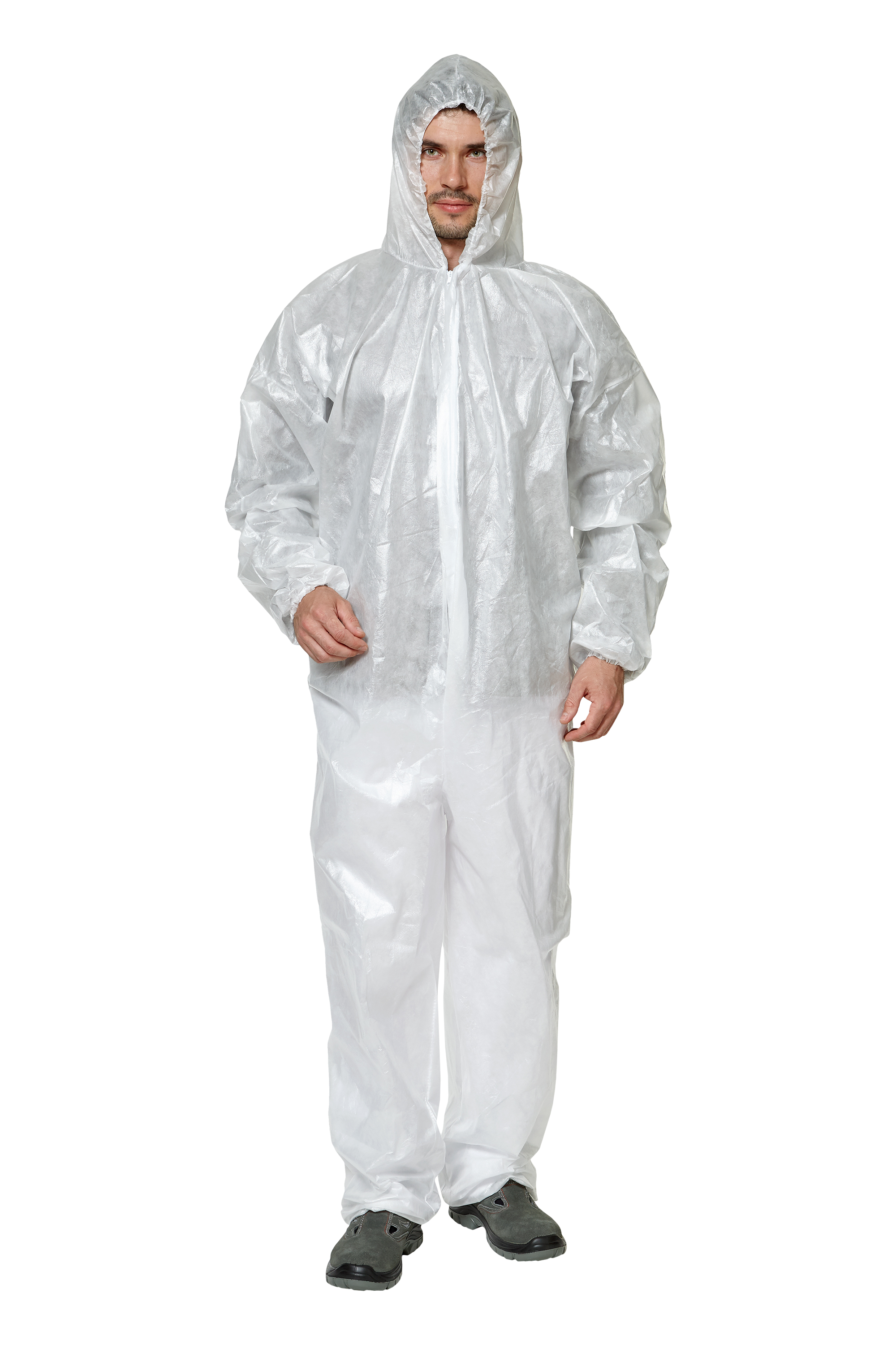 Водостойкий, лёгкий и прочный, защищает от краски, пыли, грязи. Не образует ворса. Центральная застежка на молнию. Разрешен к применению в медицине, фармацевтической и пищевой промышленности. Цвет белый или голубой