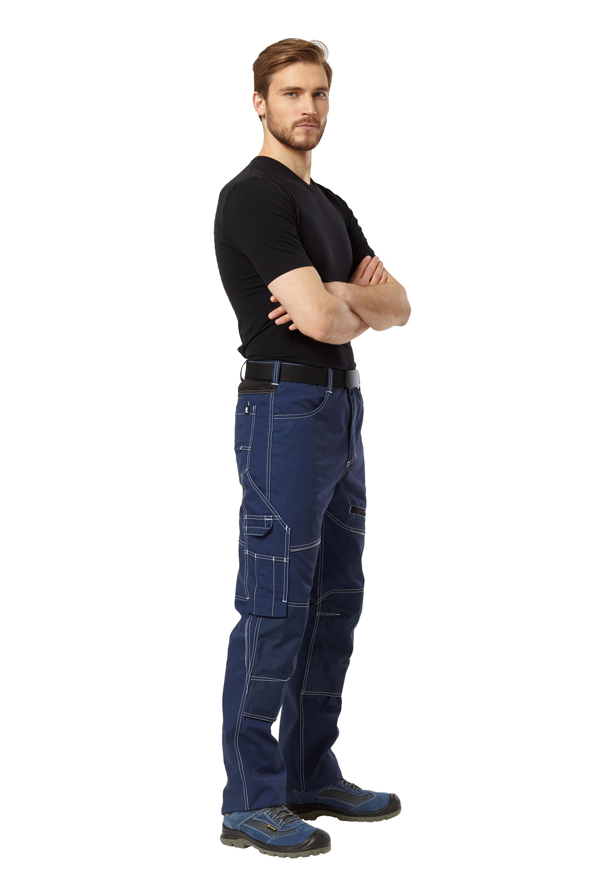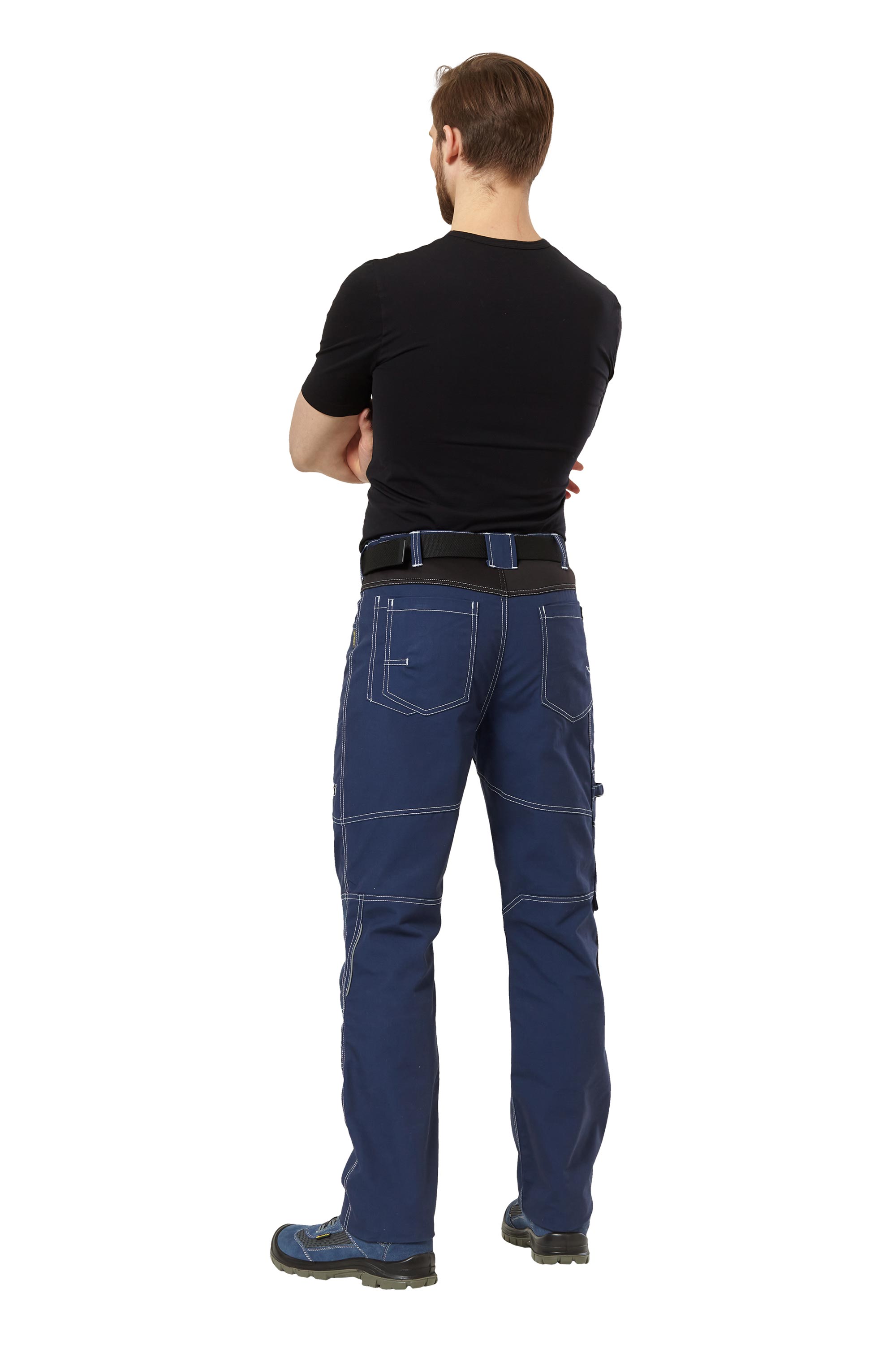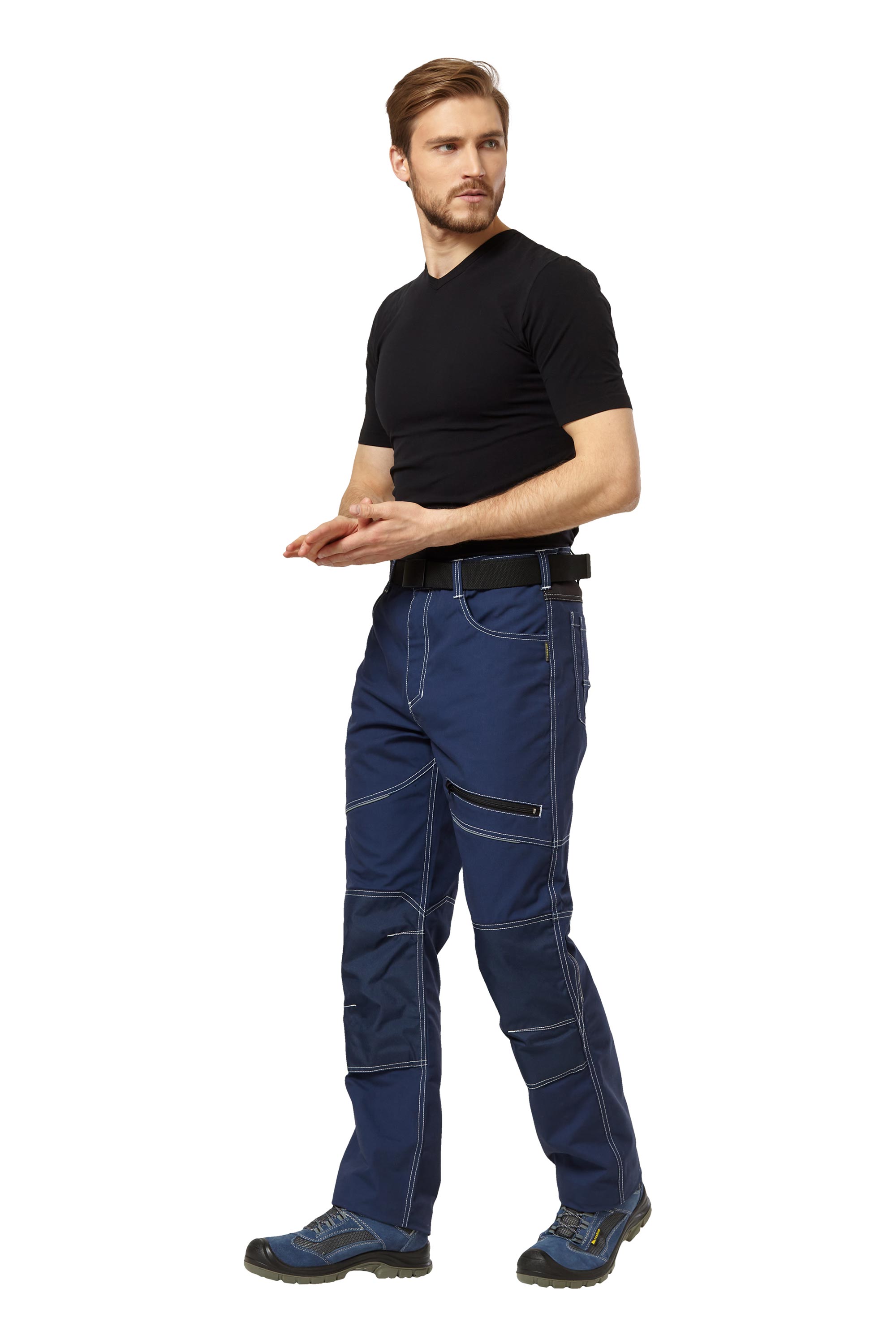 Брюки летние и демисезонные из прочной смесовой ткани темно-синего цвета с отделкой из эластичной ткани Софтшелл черного цвета, для защиты от общих производственных загрязнений.