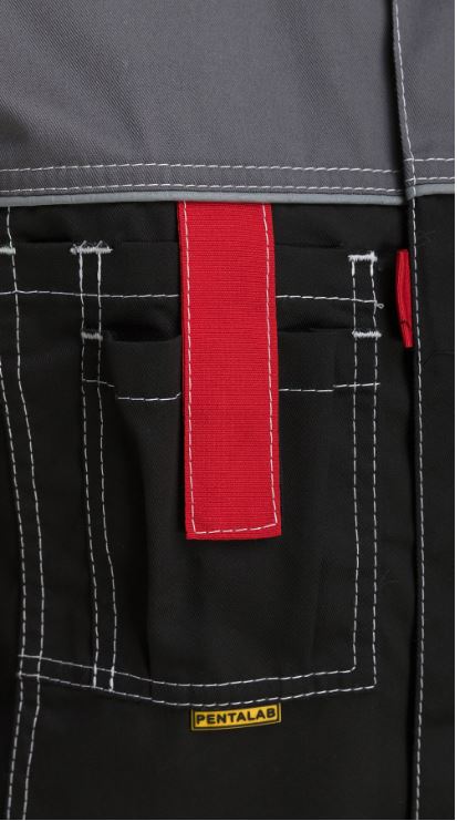 На грудке полукомбинезона расположен широкий карман с тремя отделениями, крайнее правое отделение с клапаном на липучке и с патой из контрастной репсовой ленты для удобства расстегивания.