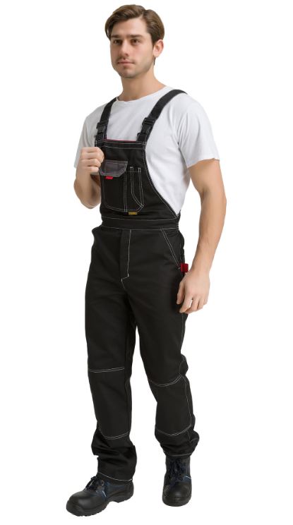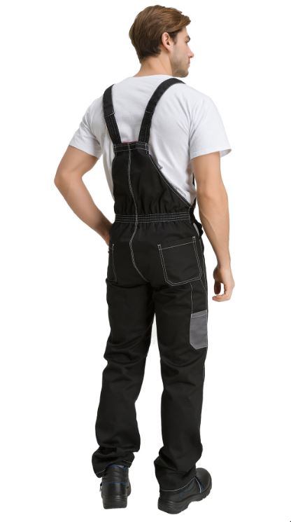 На задних половинках полукомбинезона расположены накладные карманы с петлей и карманом под инструменты. По линии талии сзади на полукомбинезоне расположена эластичная лента, благодаря которой полукомбинезон плотно прилегает к талии.