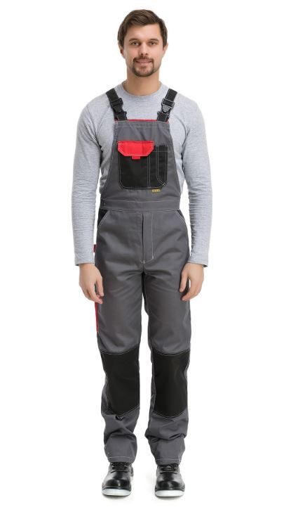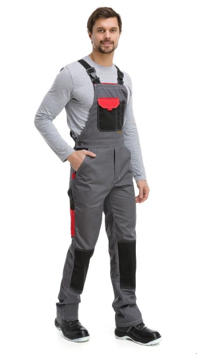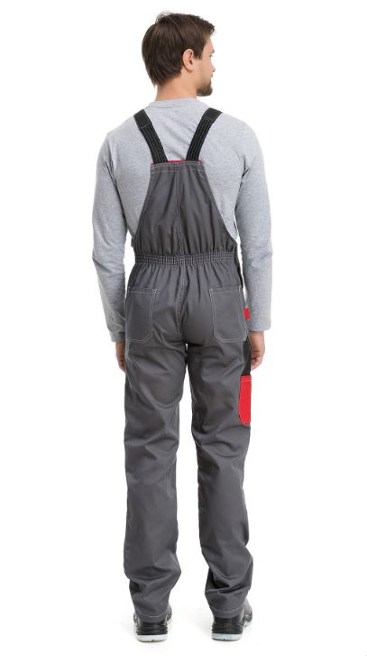 На задних половинках полукомбинезона расположены накладные карманы с петлей и карманом под инструменты. По линии талии сзади на полукомбинезоне расположена эластичная лента, благодаря которой полукомбинезон плотно прилегает к талии.