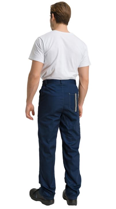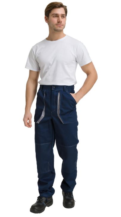 На уровне колена имеются усилительные накладки с карманами для защитных прокладок. Внешние срезы накладок уходят в боковые и шаговые швы.