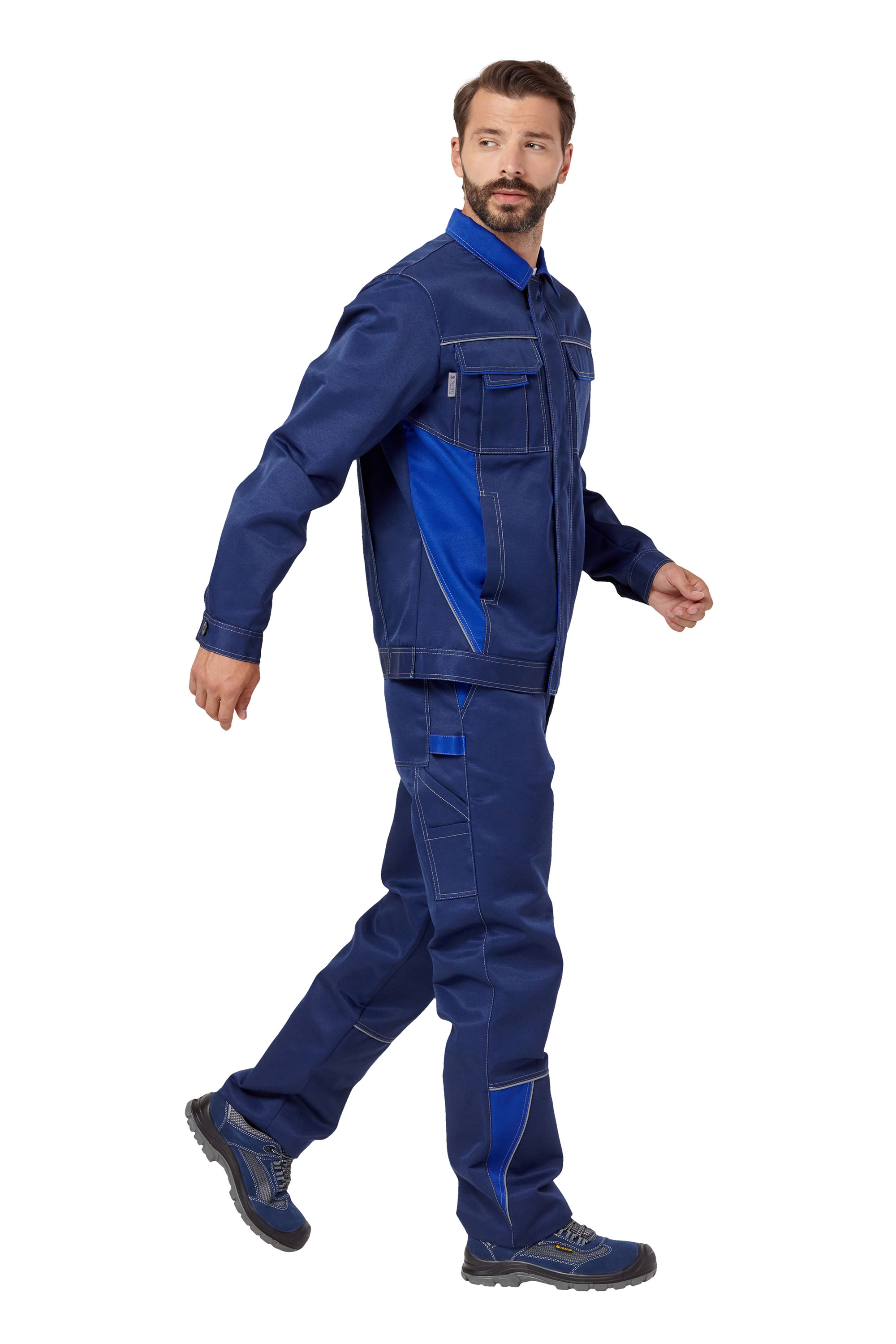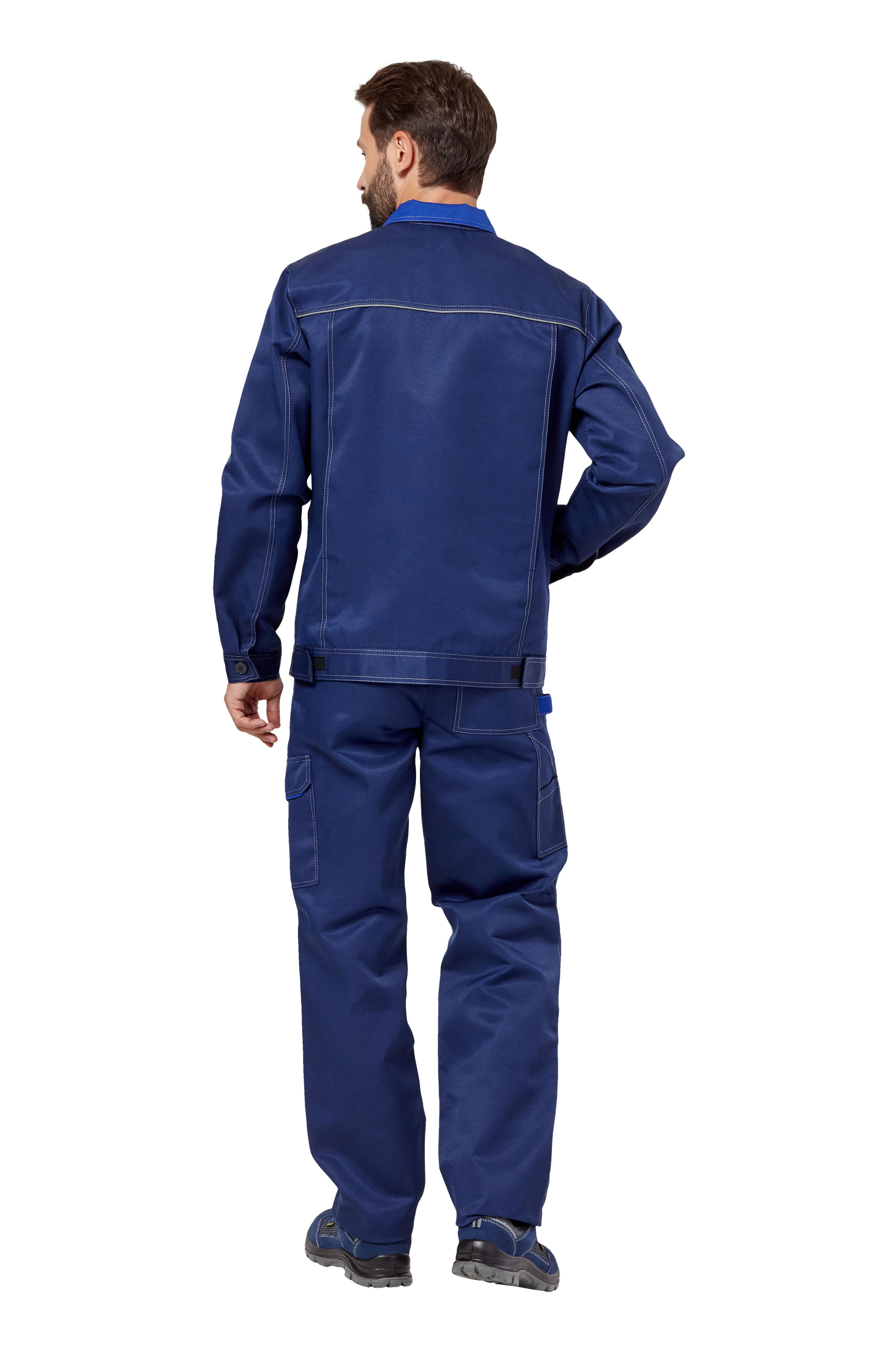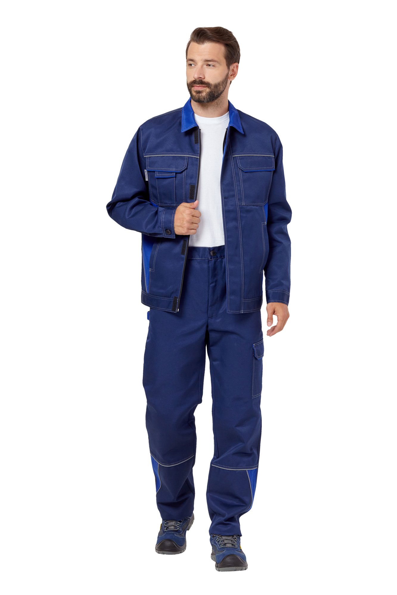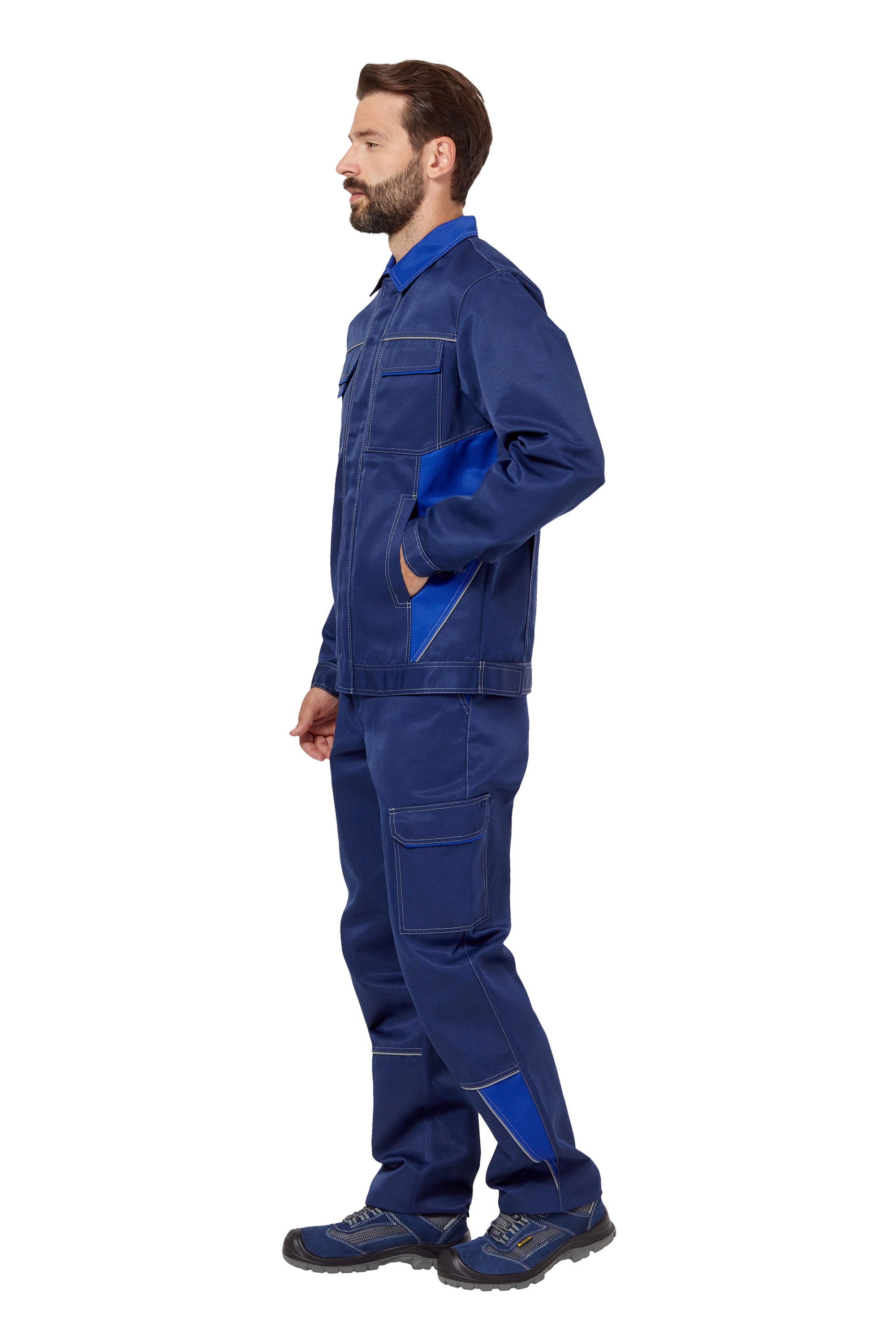 • Визуальные элементы защиты: световозвращающий кант по швам притачивания кокеток полочек и спинки, боковых отделочных деталей полочек куртки и в нижней части брюк