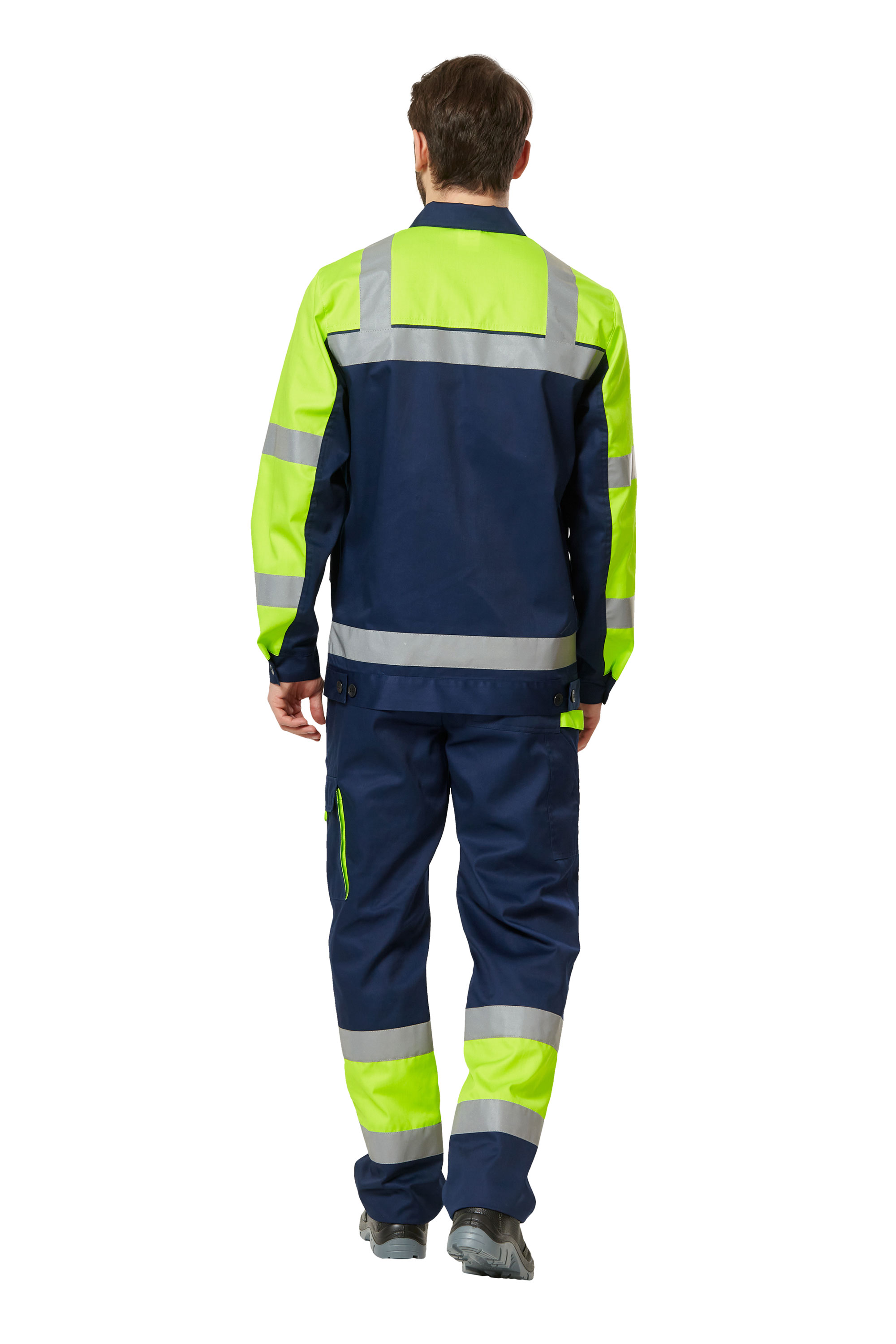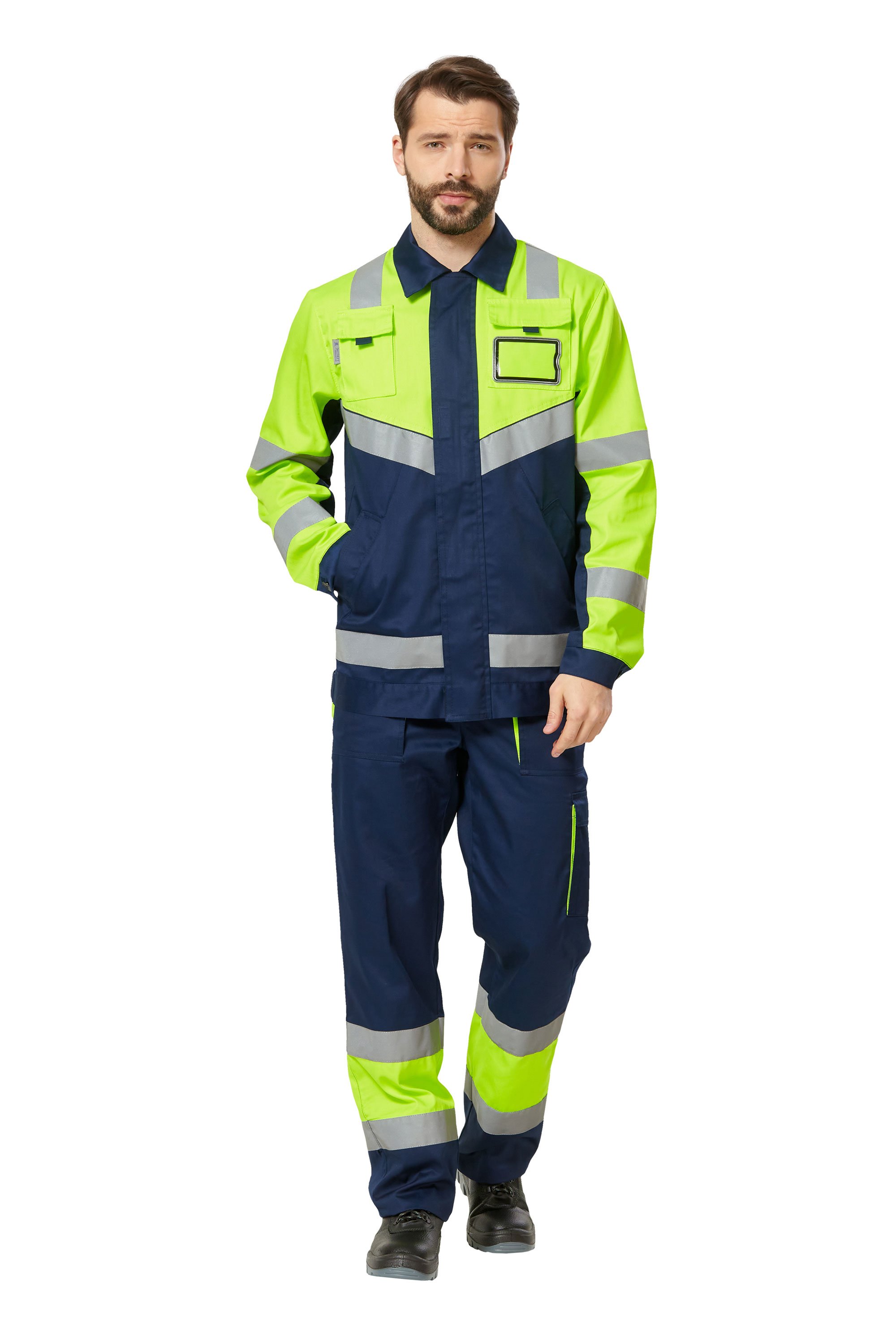 • Визуальные элементы защиты: световозвращающая лента шириной 50 мм: вертикальная на кокетках полочек и спинки, горизонтальная по швам притачивания кокеток полочек и спинки, низу куртки, средней части рукавов, и в нижней части брюк. По площади светоотражающих элементов и флуорисцентной ткани костюм соответвует III классу сигнальной защиты.