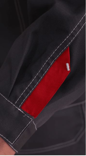 Куртка сделана из смесовой ткани TC TWILL серого цвета. Местами использована светло-серая отделка, которая смотрится свежо и контрастно вместе с яркими акцентами из красной ткани.