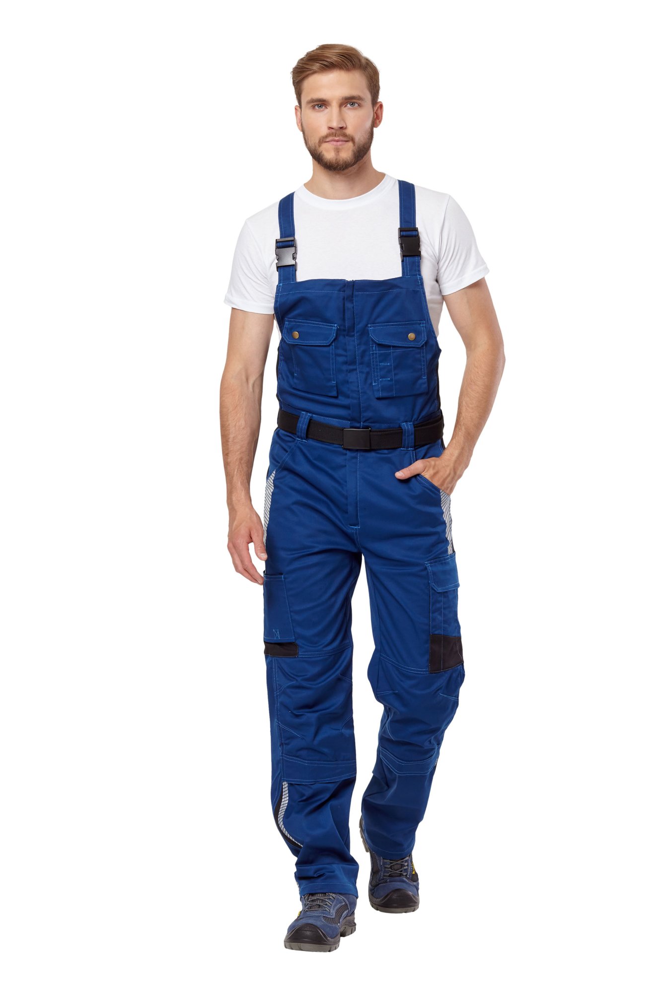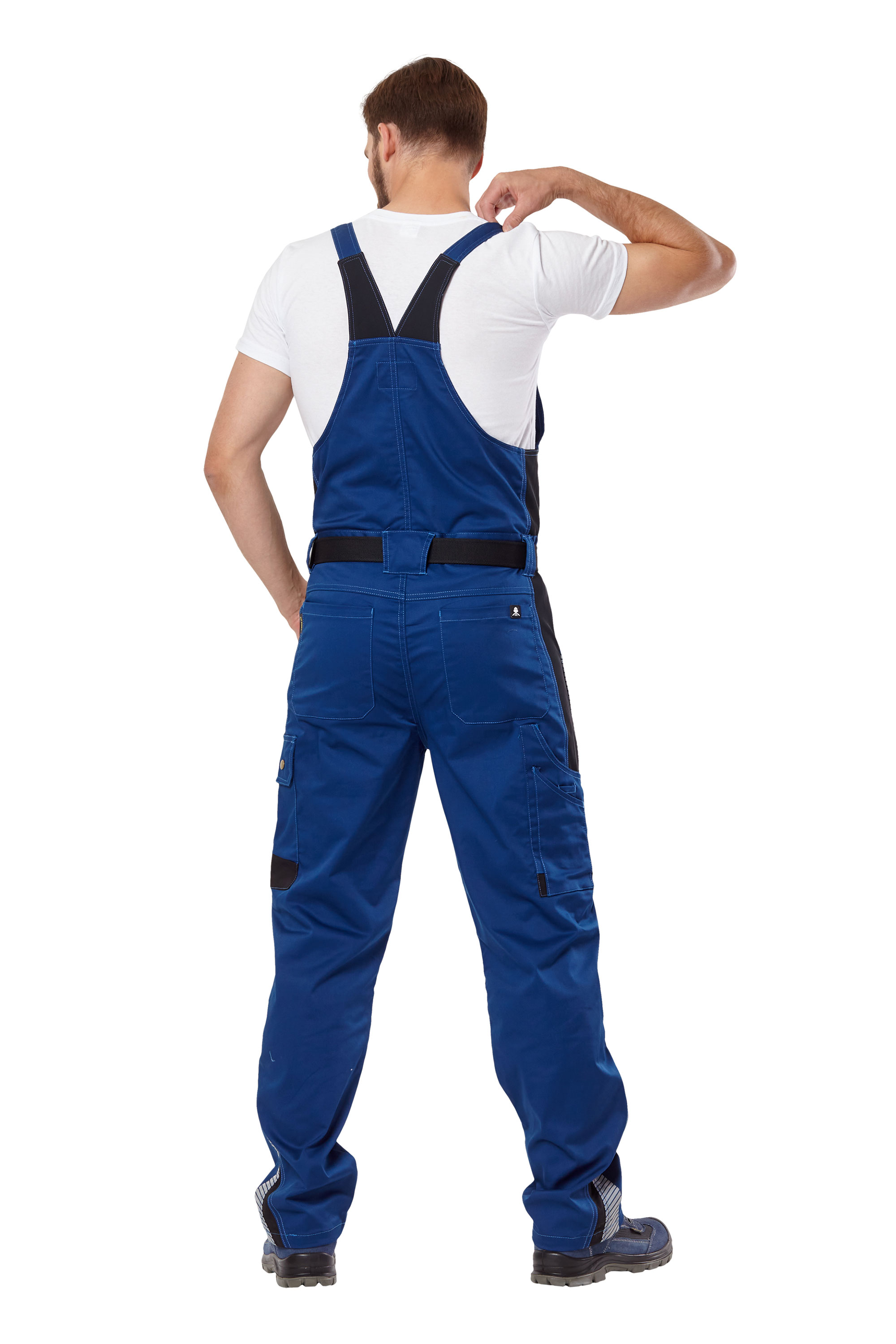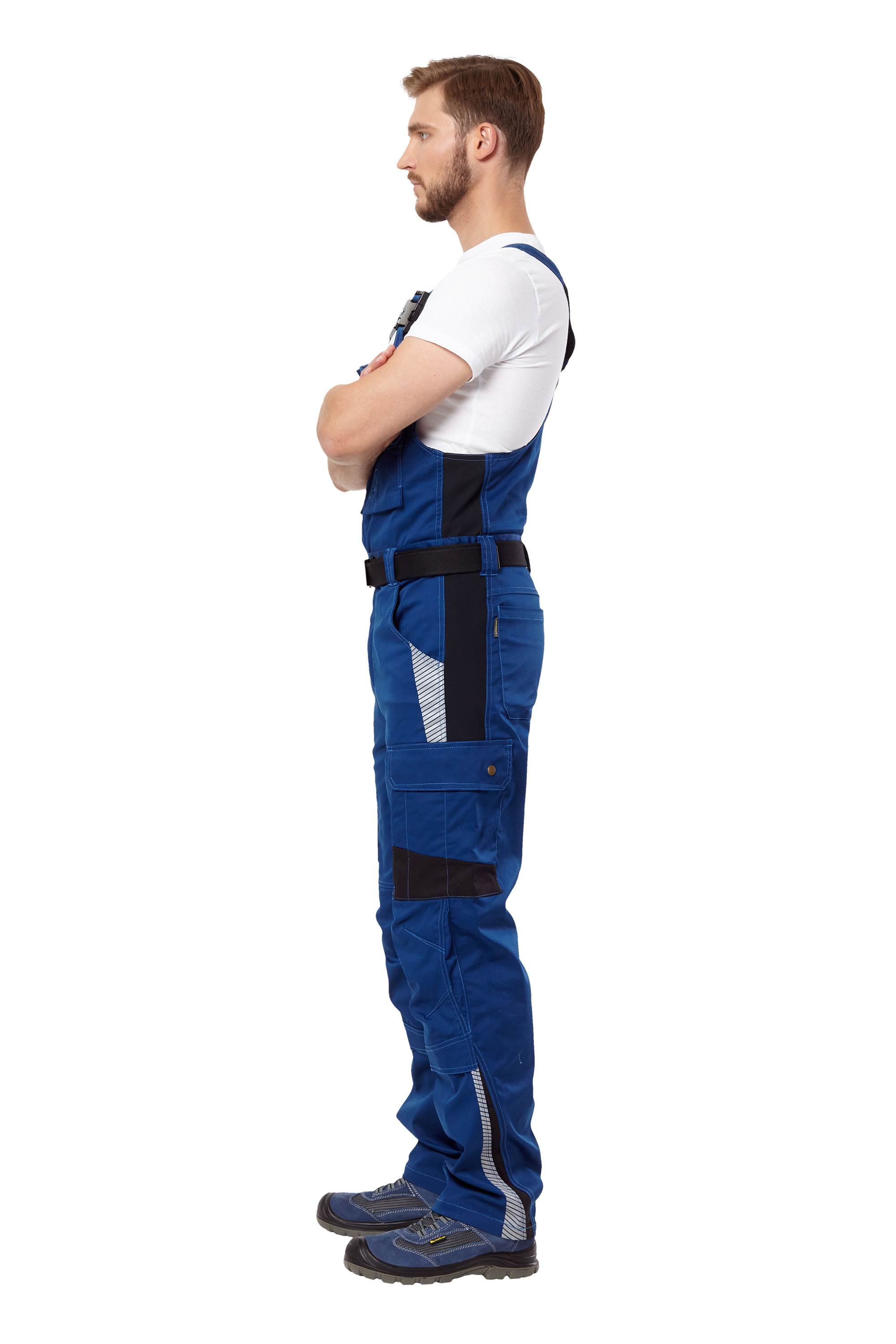 Полукомбинезон летний и демисезонный из смесовой ткани синего цвета с деталями из эластичного трикотажа черного цвета, для защиты от общих производственных загрязнений.