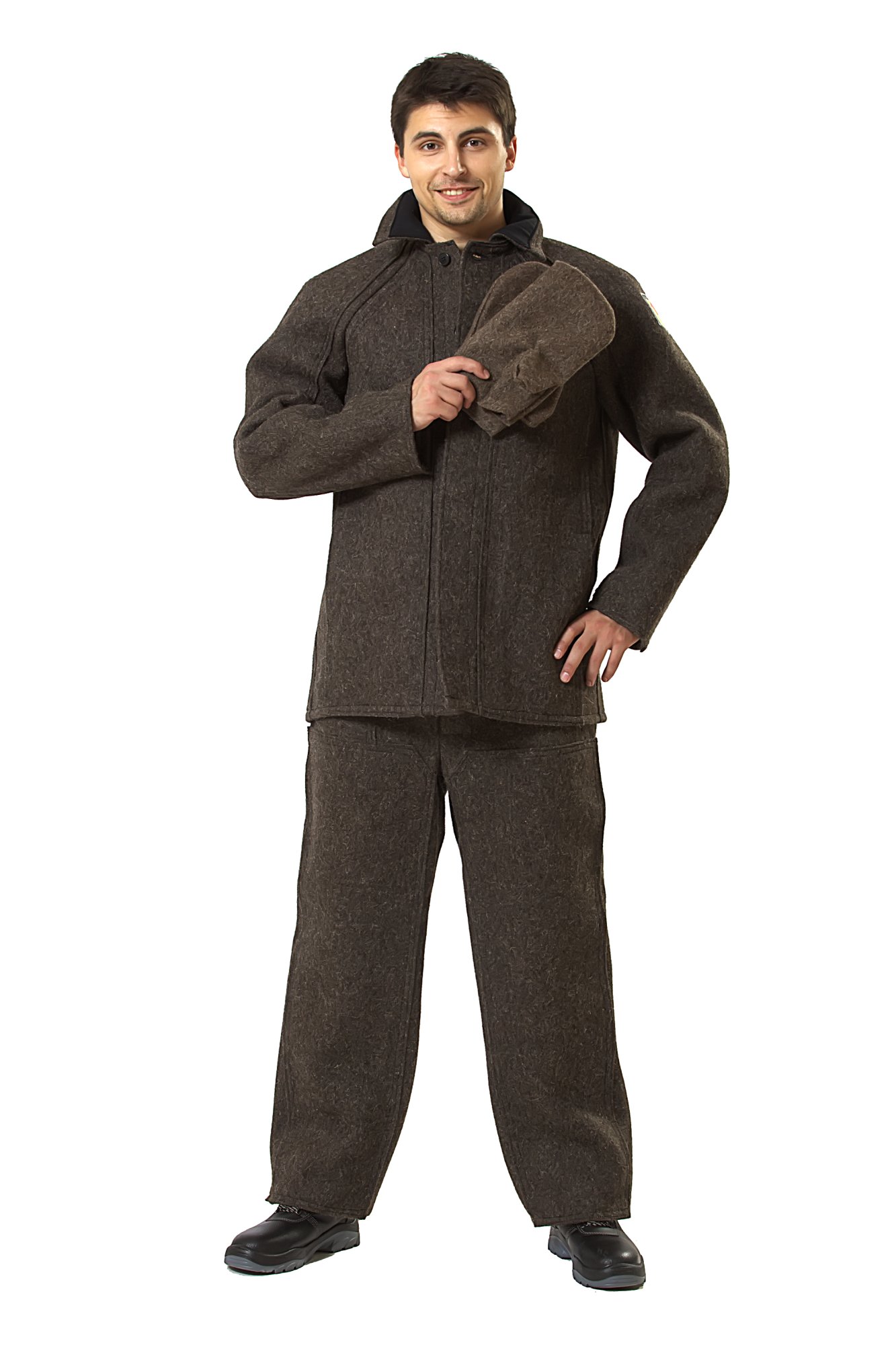 Куртка с супатной застежкой на пуговицы, два кармана в боковых швах. Брюки свободного прямого покроя. Полочки, передние части рукавов и брюк с дополнительными накладками из сукна. Верхняя часть куртки и брюк на подкладке из бязи для комфортного соприкосновения с кожей.