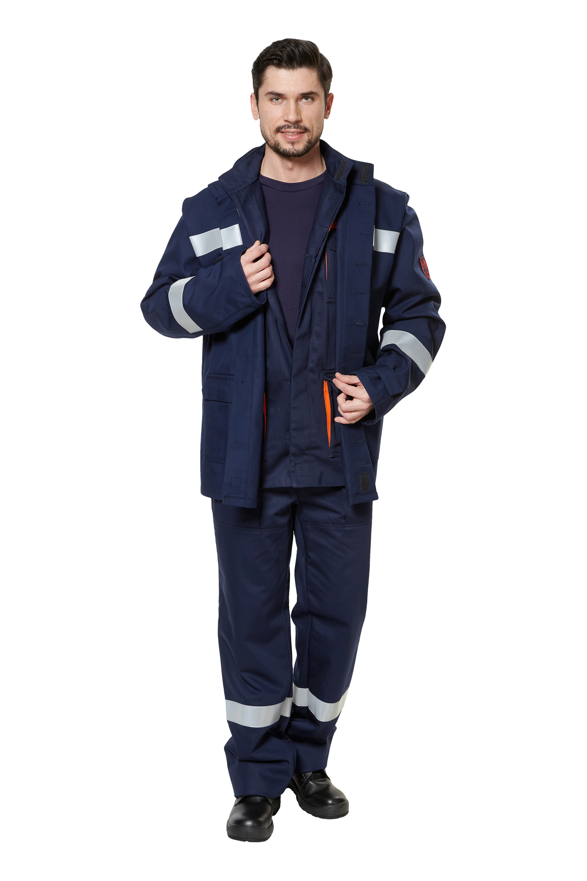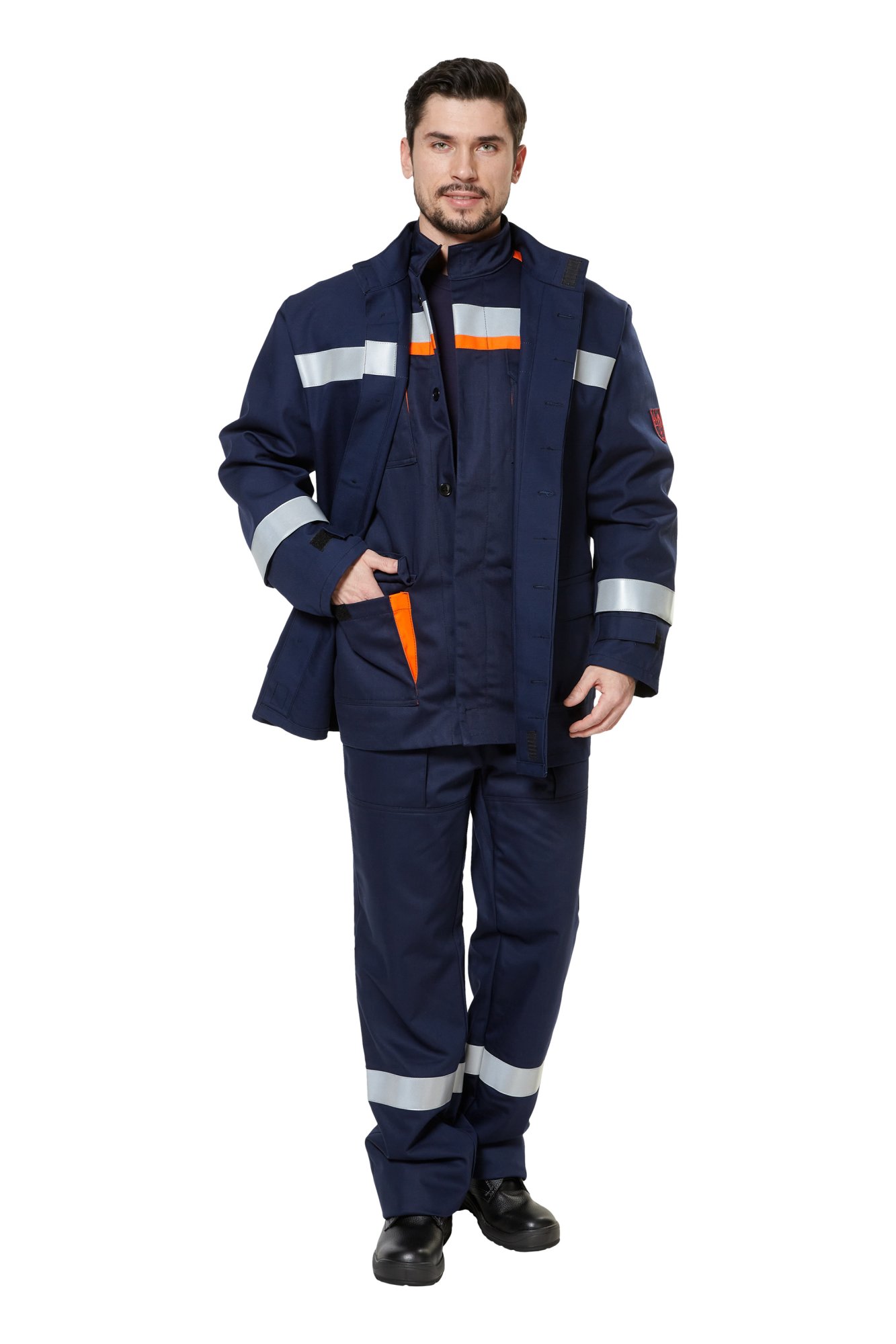 Костюм из огнезащитной ткани WORKER 265 Е (87% хлопок, 12% нейлон, 1% антистатическая нить) с дополнительными защитными накладками из ткани WORKER 320 Е.