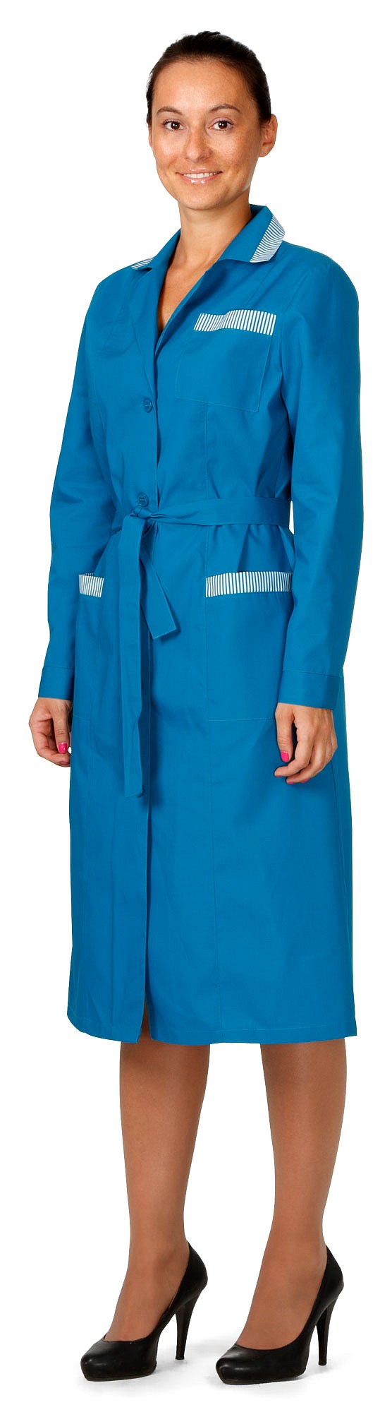 Халат с центральной застежкой на пуговицы, с поясом и накладными карманами.