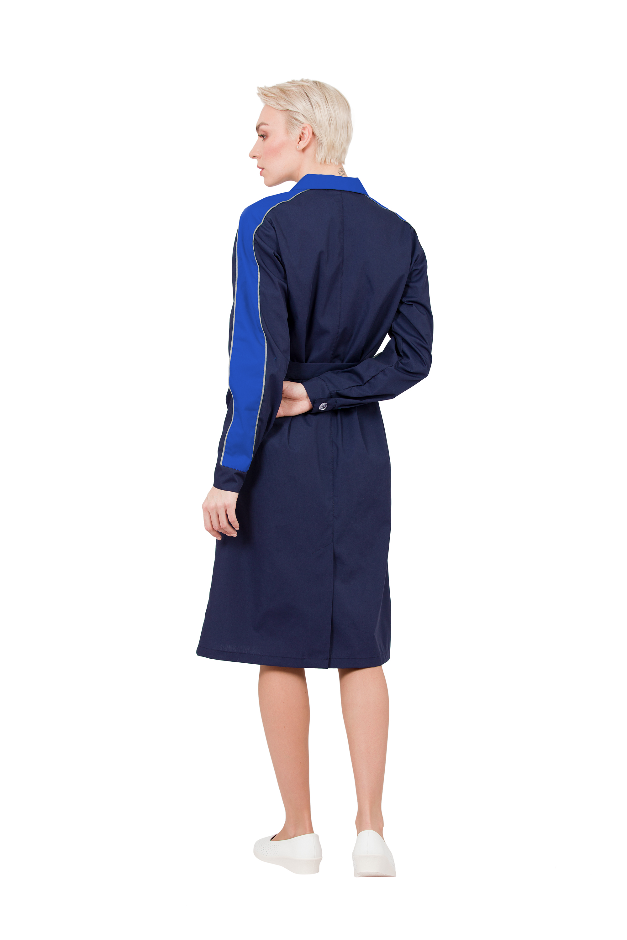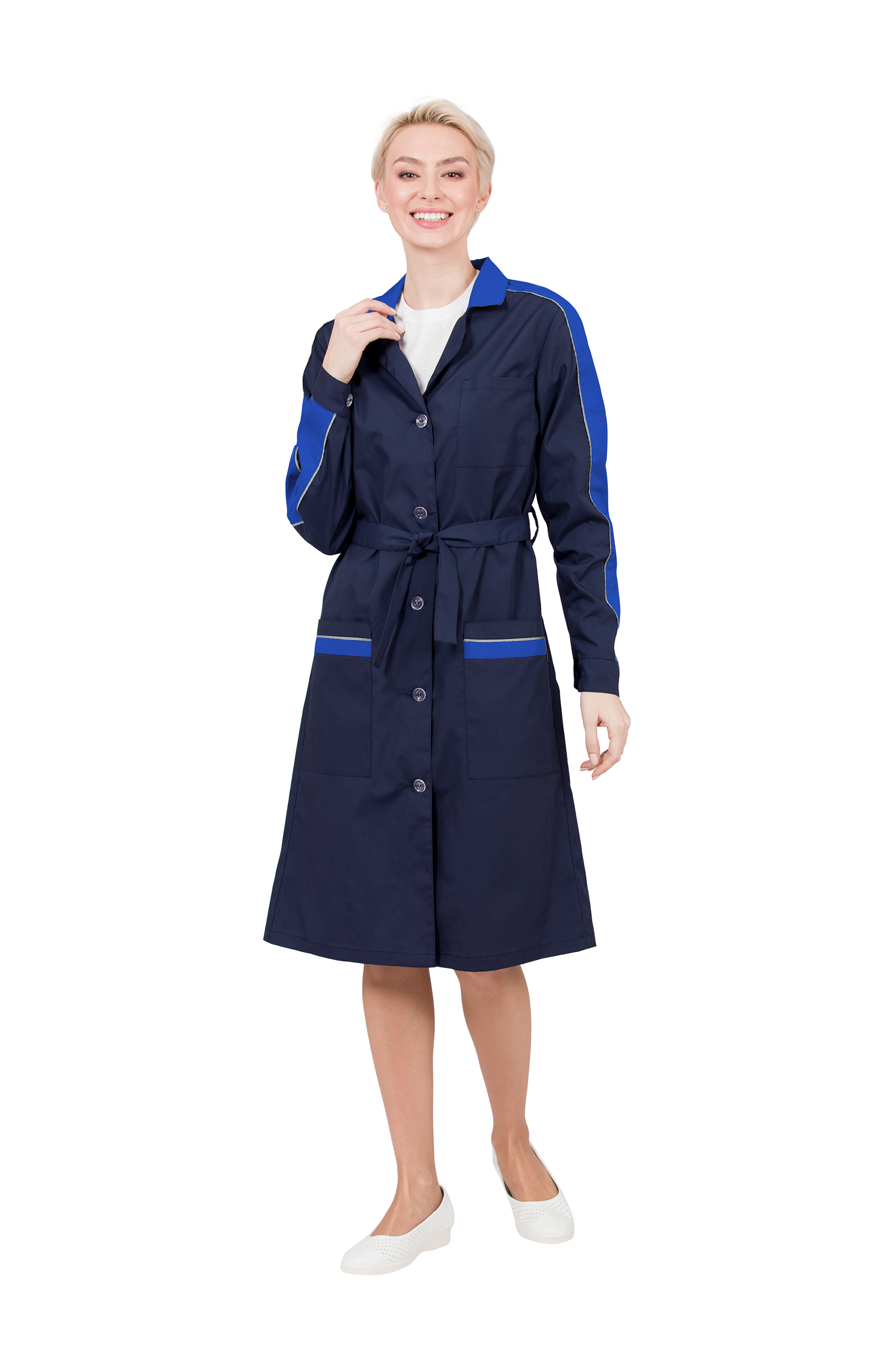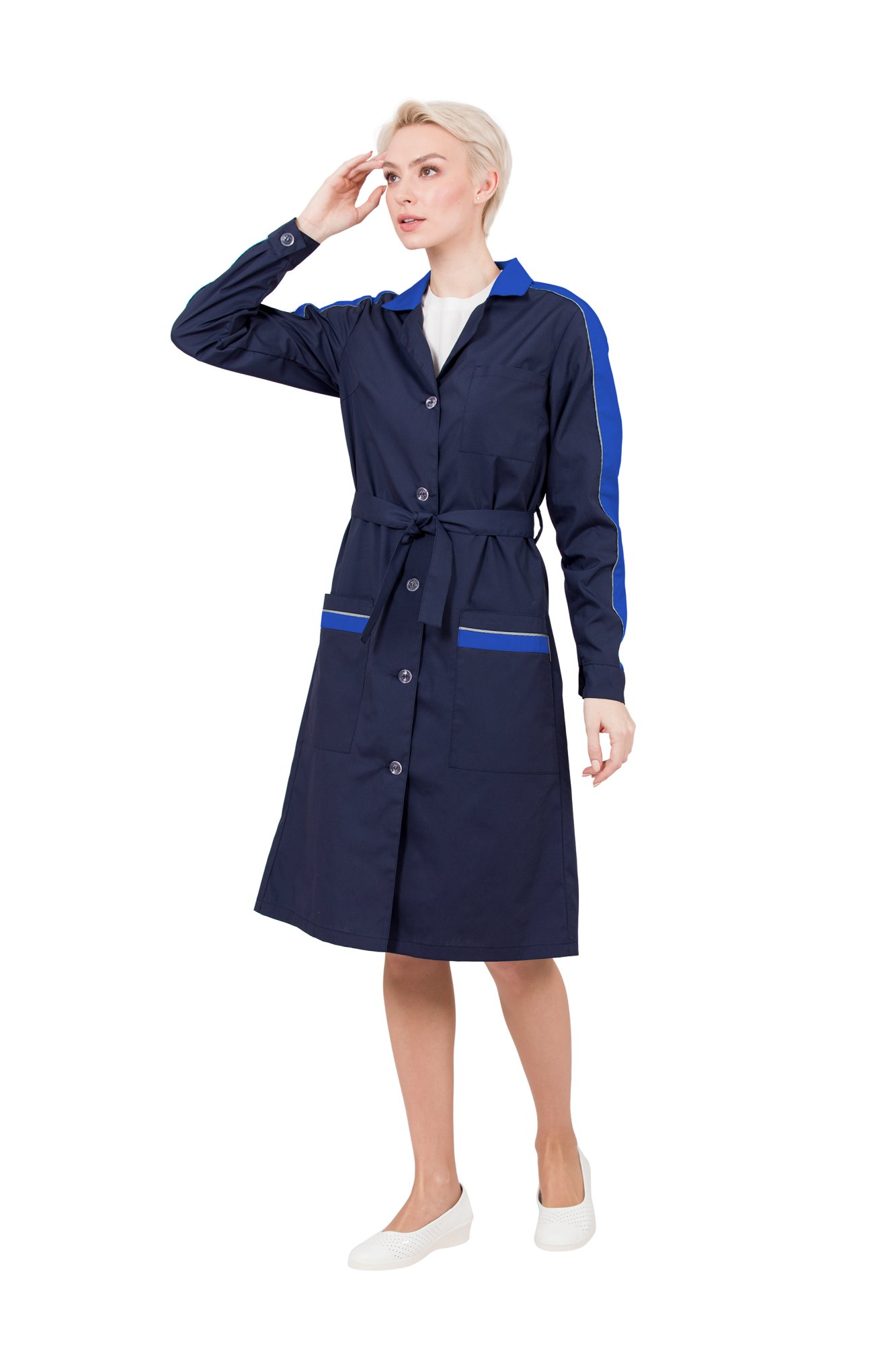 Халат полуприлегающего силуэта с центральной застежкой на пуговицы, отложным воротником, с накладными и нагрудным карманами, рукав - длинный, объем по талии регулируется поясом.