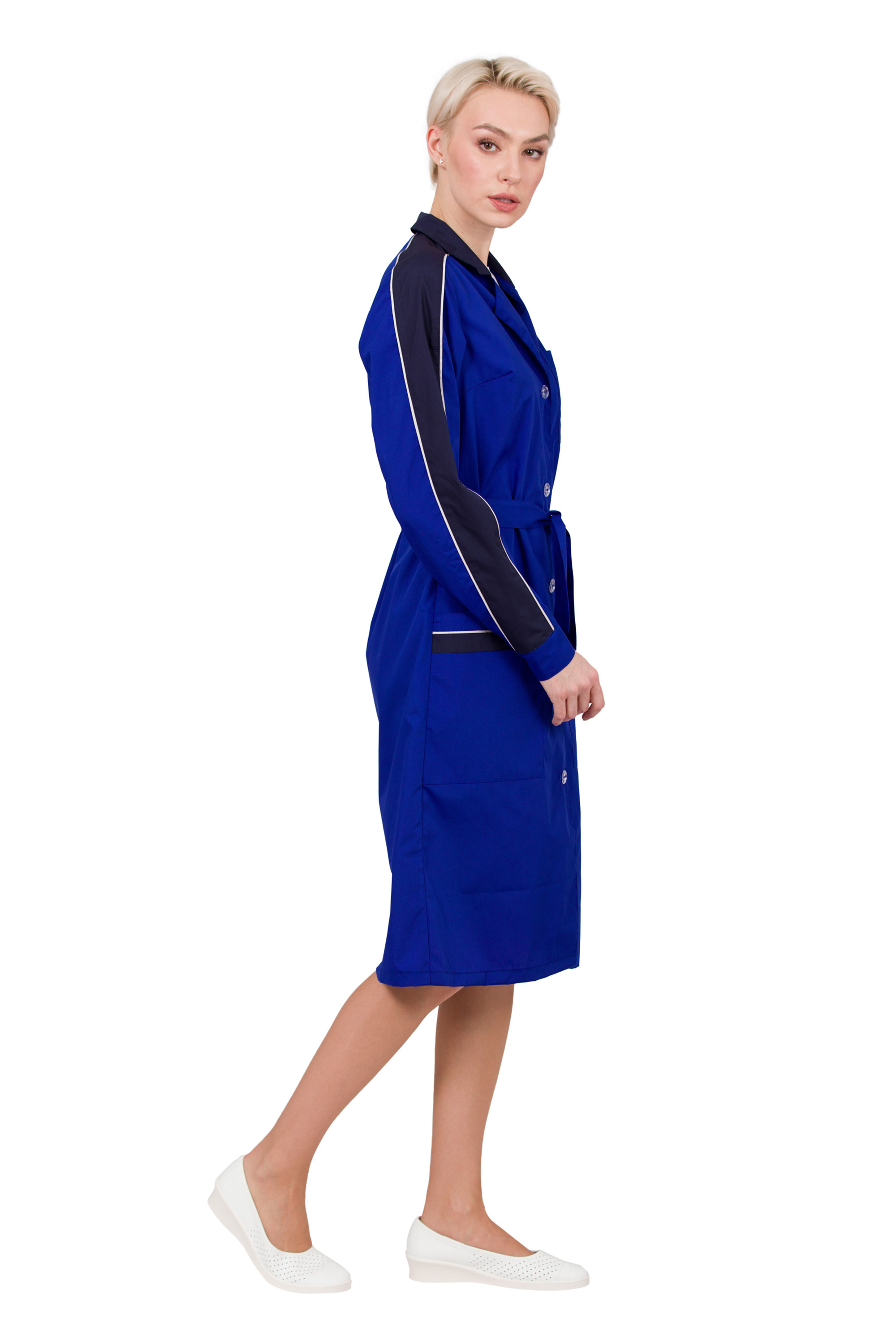Халат полуприлегающего силуэта с центральной застежкой на пуговицы, отложным воротником, с накладными и нагрудным карманами, рукав - длинный, объем по талии регулируется поясом.