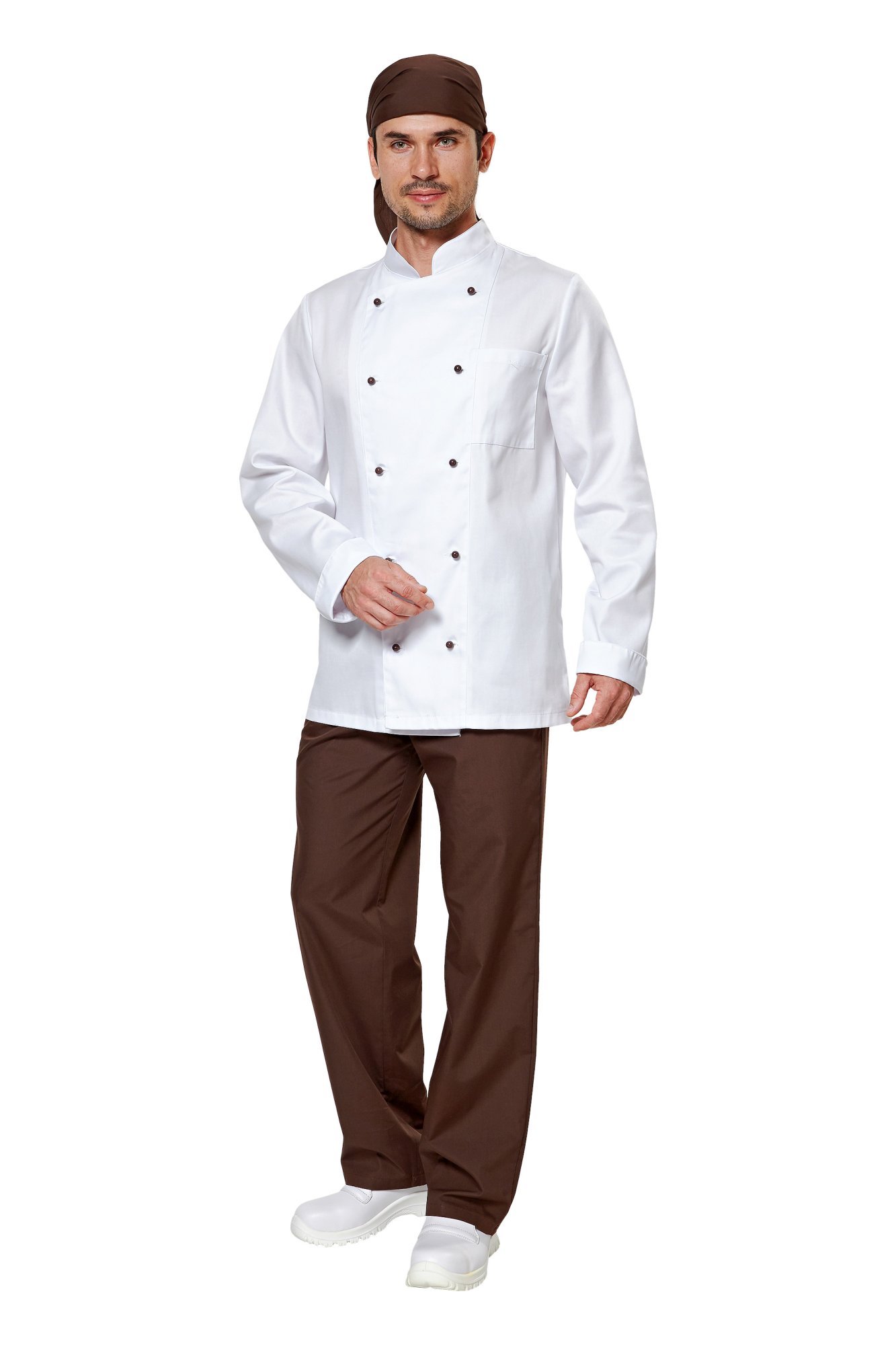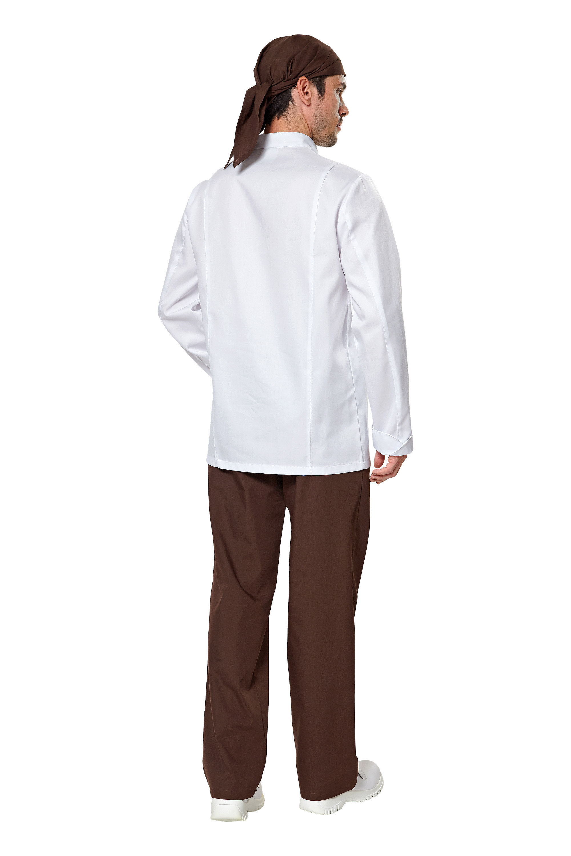 Куртка ( пл.210 г/м² ) двубортная, с застежкой на пукли контрастного цвета, воротник-стойка. Брюки ( пл.115г/м² ) свободного покроя, из контрастной ткани, объем по талии регулируется эластичной тесьмой. В комплект входит косынка в цвет брюк.