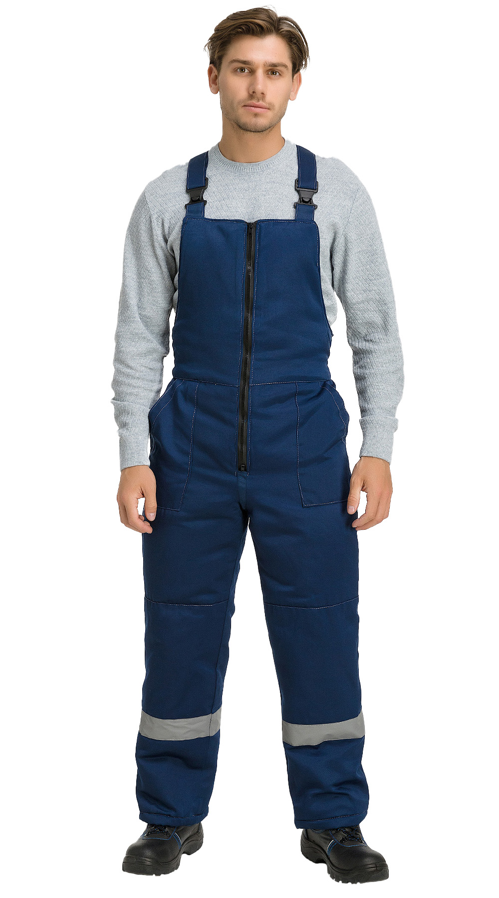 В комплекте с курткой идет полукомбинезон, закрывающий грудь и поясницу, что особенно актуально для зимней одежды. Полукомбинезон застегивается на молнию, которую можно открыть как сверху, так и снизу. Бретели с резинкой, регулируются по длине, обеспечивая эргономичность и свободу движения, эластичная кулиса на спинке — комфортное прилегание. Такую одежду удобно носить в течение всего трудового дня. На полукомбинезоне предусмотрены накладные карманы, а также накладки на колени для повышения срока эксплуатации, поскольку эти части подвергаются наибольшему износу и загрязнению.