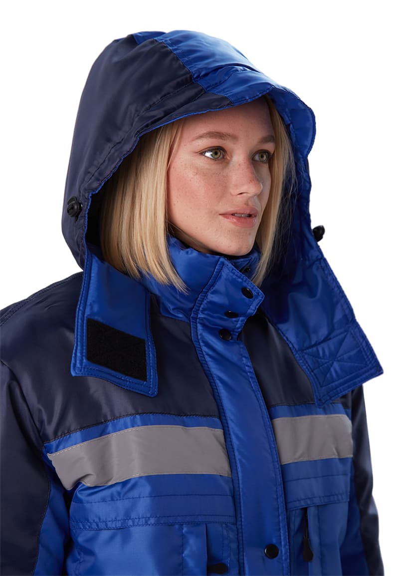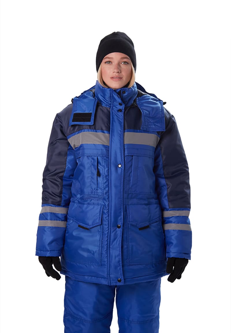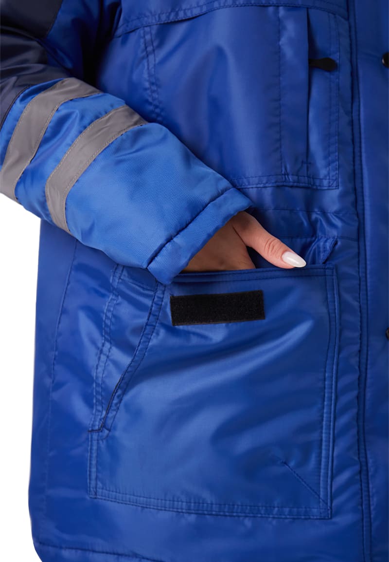 Куртка прямого силуэта с центральной застежкой на молнию и ветрозащитной утепленной планкой на кнопках. Нагрудные накладные карманы со входом на молнию. Нижние накладные, утепленные мягким флисом, двойные карманы, с клапаном на липучке и стропой для удобства расстегивания. Верхняя часть полочек и спинки выделены широкой лентой СОП. Рукава с трикотажной манжетой, на нижней части рукавов узкие ленты СОП в два ряда. По линии талии и линии низа куртки - кулиса со шнуром-резинкой и фиксаторами. Внутренний накладной карман на липучке со стороны левой подкладки полочки. Воротник-стойка, внутренняя часть на флисе. Капюшон утепленный, с подкладкой из мягкого флиса, с козырьком, кулисой по лицевой части со шнуром-резинкой и фиксаторами, на затылочной части капюшона - хлястик на липучке для регулировки высоты капюшона. Застежка капюшона по лицевой части на липучках.