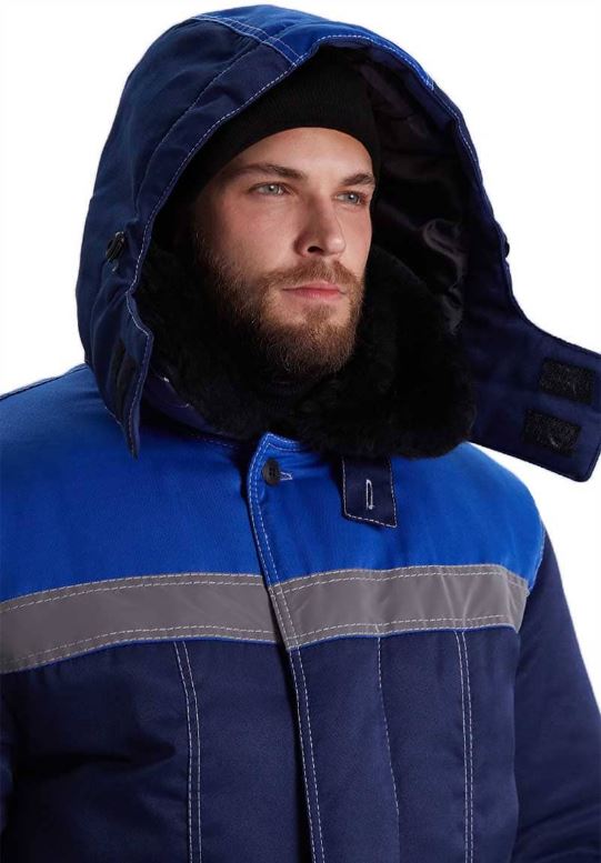 Удлиненная модель. Куртка с супатной застежкой на петлю и пуговицу. Отстегивающийся утепленный капюшон. Воротник из искусственного меха. Боковые карманы с клапаном, внутренний карман для документов. Кулиски по линии талии и низу. Рукава с напульсниками. Светоотражающий СОП 50 мм по кокеткам полочки и спинки.