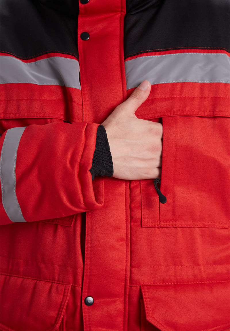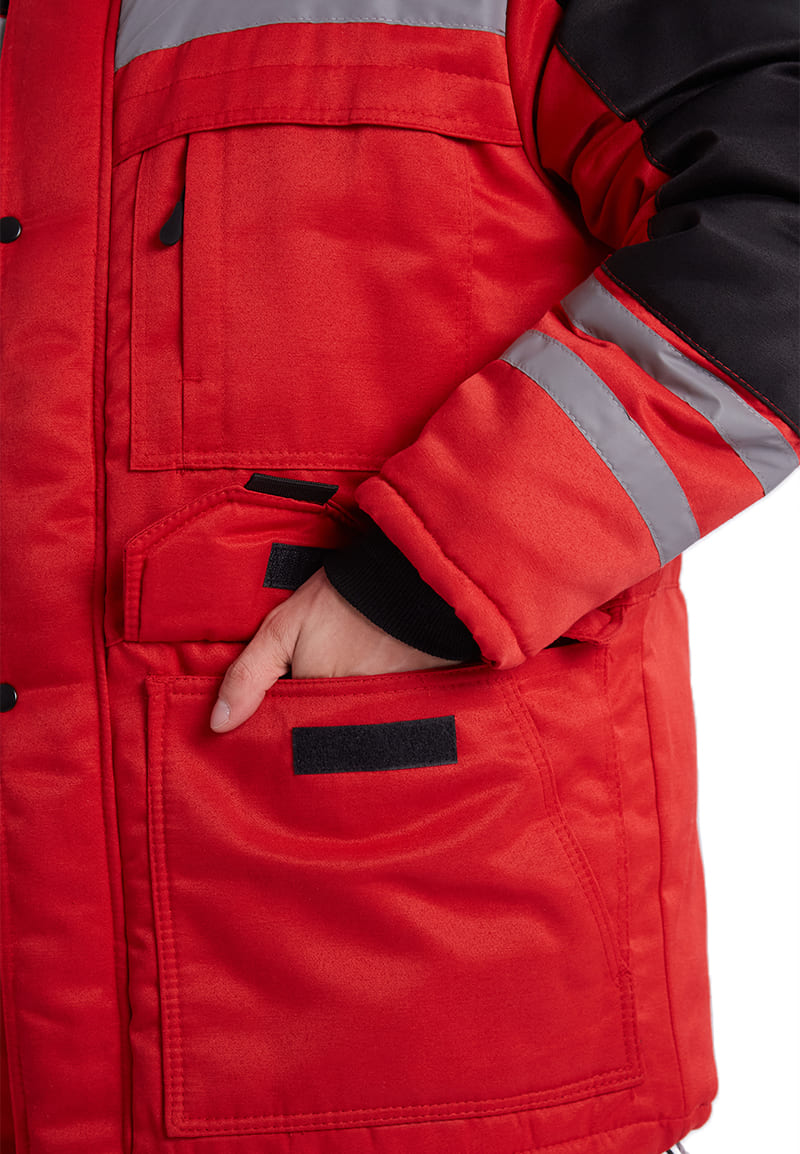 Куртка прямого силуэта с центральной застежкой на молнию и ветрозащитной утепленной планкой на кнопках. Нагрудные накладные карманы со входом на молнию. Нижние накладные, утепленные мягким флисом, двойные карманы, с клапаном на липучке и стропой для удобства расстегивания. Верхняя часть полочек и спинки выделены широкой лентой СОП. Рукава с трикотажной манжетой, на нижней части рукавов узкие ленты СОП в два ряда. По линии талии и линии низа куртки - кулиса со шнуром-резинкой и фиксаторами. Внутренний накладной карман на липучке со стороны левой подкладки полочки. Капюшон утепленный, с подкладкой из мягкого флиса, с козырьком, кулисой по лицевой части со шнуром-резинкой и фиксаторами, на затылочной части капюшона - хлястик на липучке для регулировки высоты капюшона.