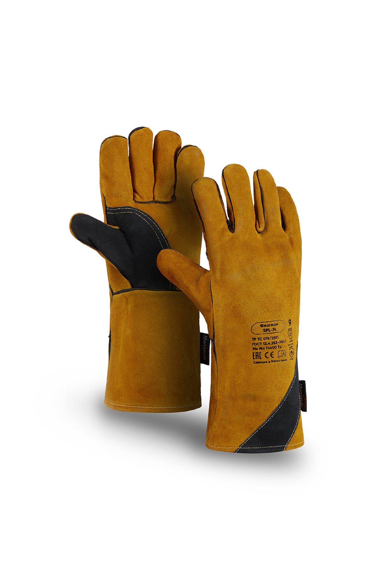 У основания средних пальцев специальная кожная вставка для увеличения износостойкости. Тыльная сторона выполнена из цельного спилкового лоскута. Для дополнительной защиты в рабочей зоне ладони и большого пальца имеется усиливающая накладка. Швы - двойные, нитью Kevlar®. Для увеличения износостойкости периметр швов также усилен специальной кожаной вставкой. Подкладка из флиса в ладонной части обеспечивает комфорт и абсорбирование влаги, а также снижает ударные нагрузки на руку. Краги защищают руки от искр и брызг расплавленного металла, механических нагрузок при сварочных работах, контакта с нагретой поверхностью до 400 °С.