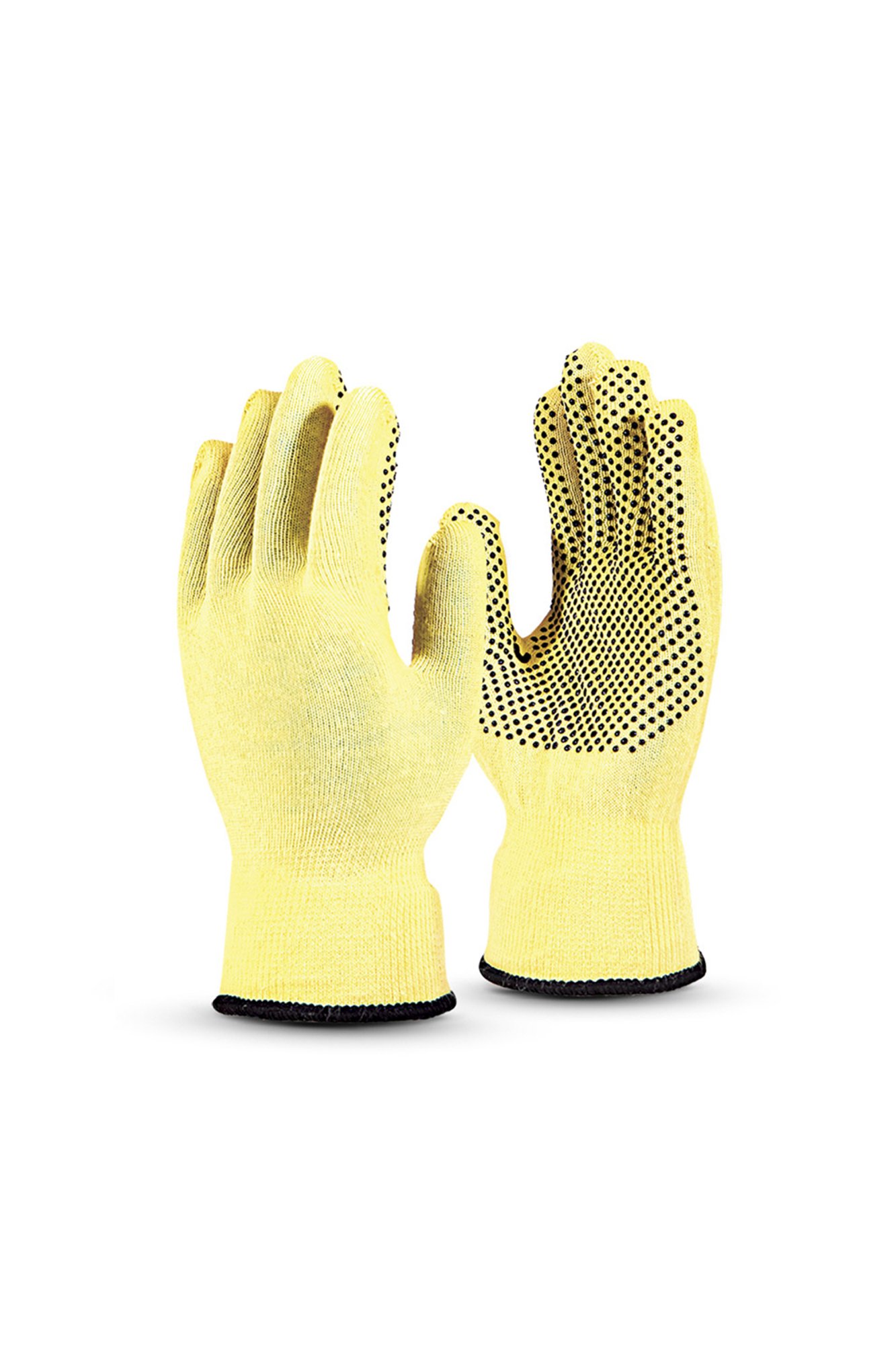 Волокно Kevlar® не поддерживает горение и не плавится (t °C разложения 430-480 °С). Перчатки имеют отличную стойкость к разрыву (в 5 раз выше стали при одинаковой массе), сохраняют прочность и эластичность при низких температурах вплоть до криогенных (-196 °С). Нанесение точки ПВХ по технологии SlipGrip® дает превосходные сцепные свойства и увеличивает стойкость к истиранию. Двойной оверлок с цветовой индикацией размера.