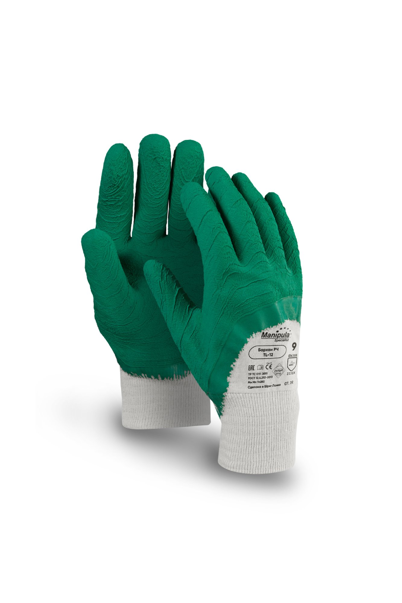 Рифленая текстура поверхности из плотного латекса обеспечивает отличный захват предметов, а также высокую стойкость к истиранию и проколам. Толщина рабочей поверхности дает возможность контакта с нагретой поверхностью до 250 °С. Частичный облив тыльной стороны для улучшения воздухообмена. Трикотажная манжета надежно фиксирует руку в перчатке во время работы, защищая запястные вены от механических повреждений, а также попадания в манжету пыли и грязи. Анатомическая форма перчатки снижает усталость рук. Для предотвращения возникновения микробной среды и устранения неприятных запахов после производственного процесса перчатка прошла антибактериальную обработку Sanitized Actifresh®.